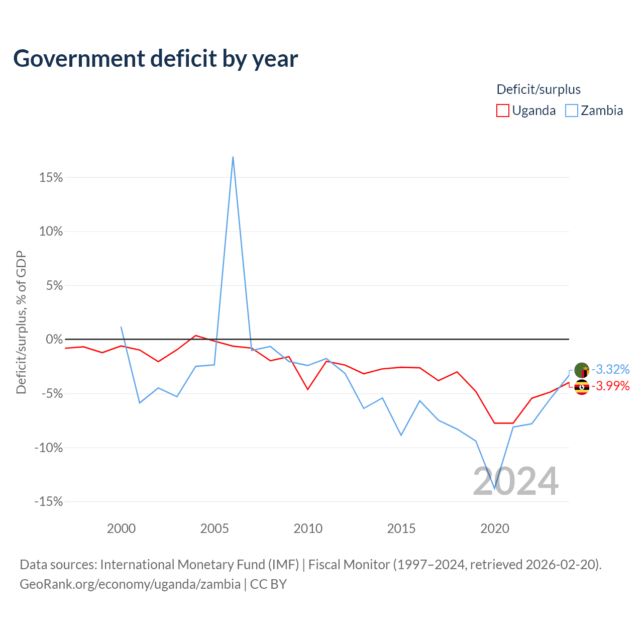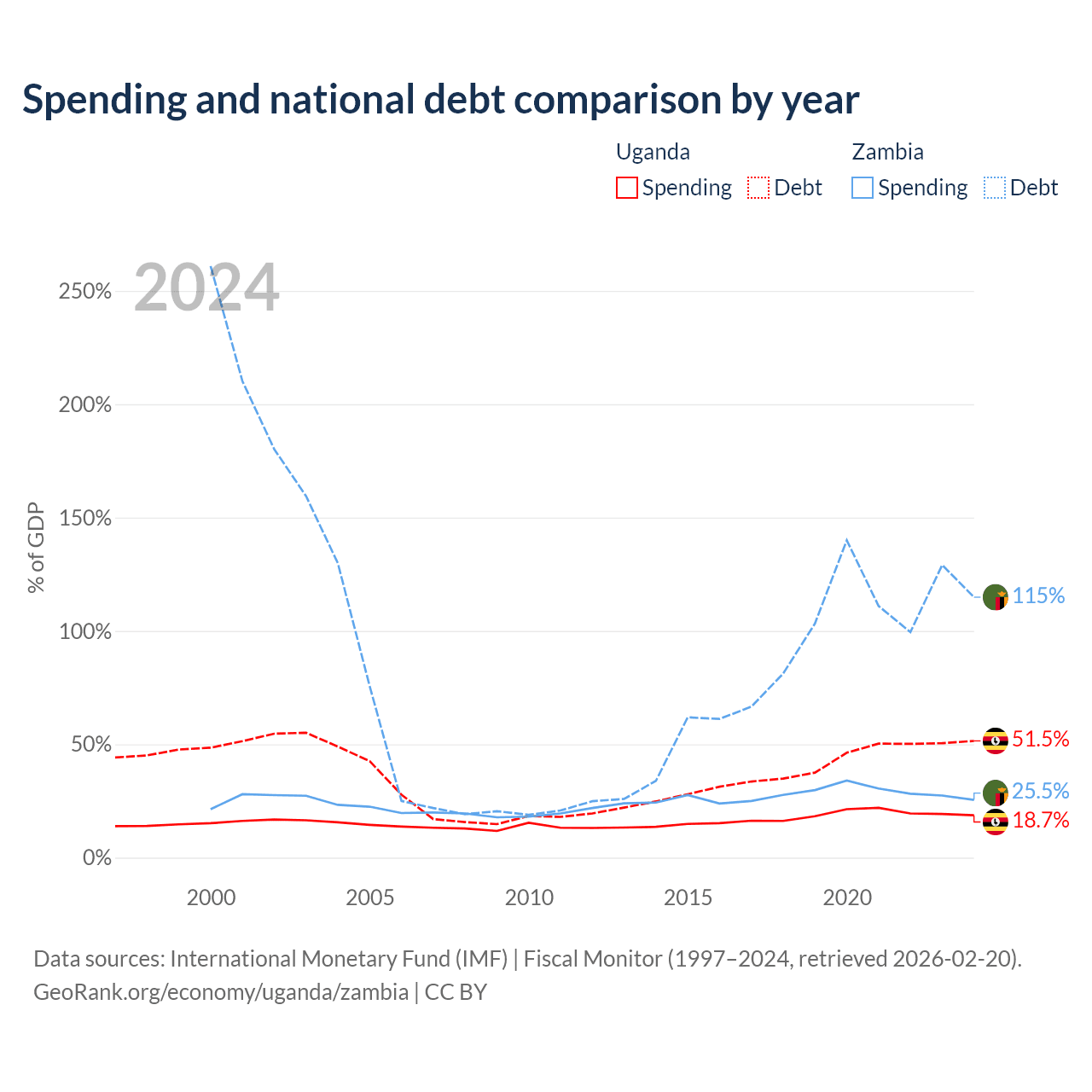 Uganda has $27.8B in government debt (51.5% of GDP), compared to $29.1B (114.9% of GDP) in Zambia.