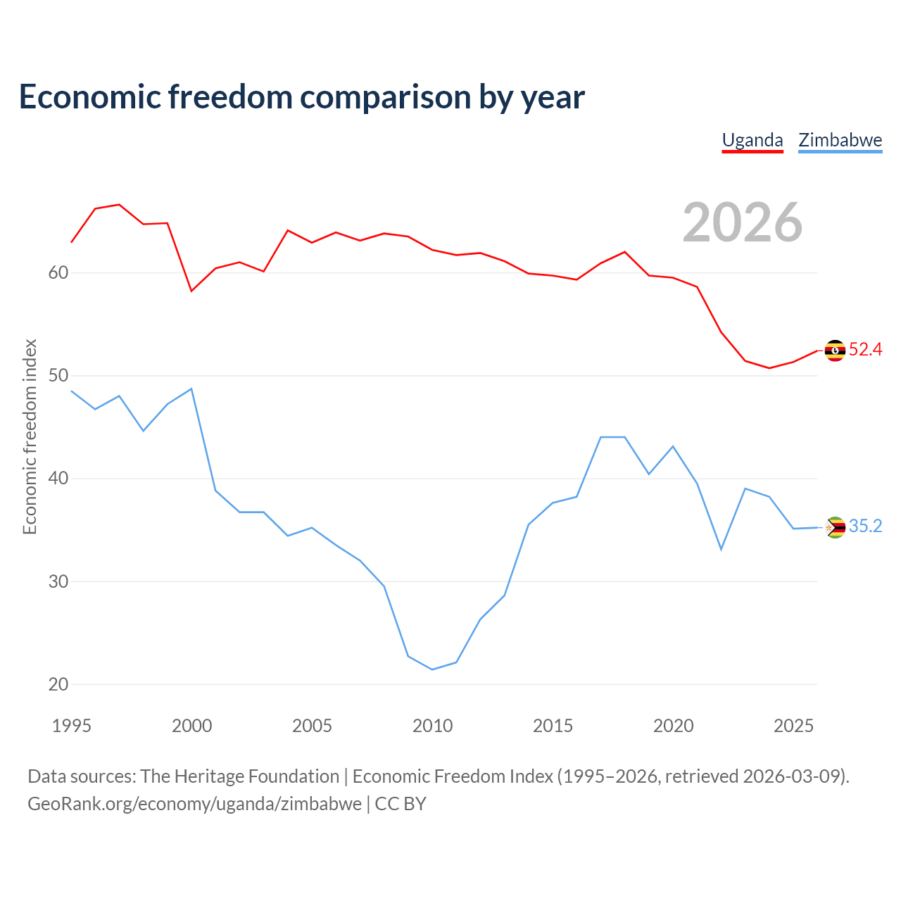 The Economic Freedom Index for Uganda is 52.4, ranking 149/197, compared to 35.2 for Zimbabwe, ranking 190/197. The chart above displays a comparison of annual changes in economic freedom indexes.