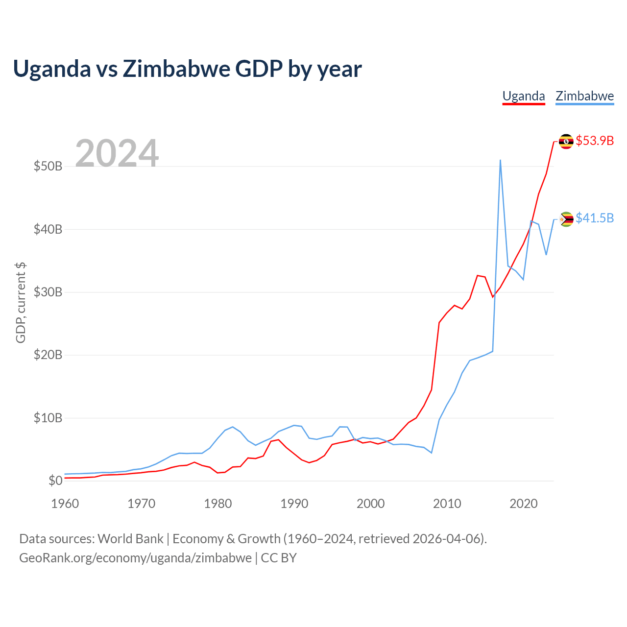 Uganda vs Zimbabwe GDP by year