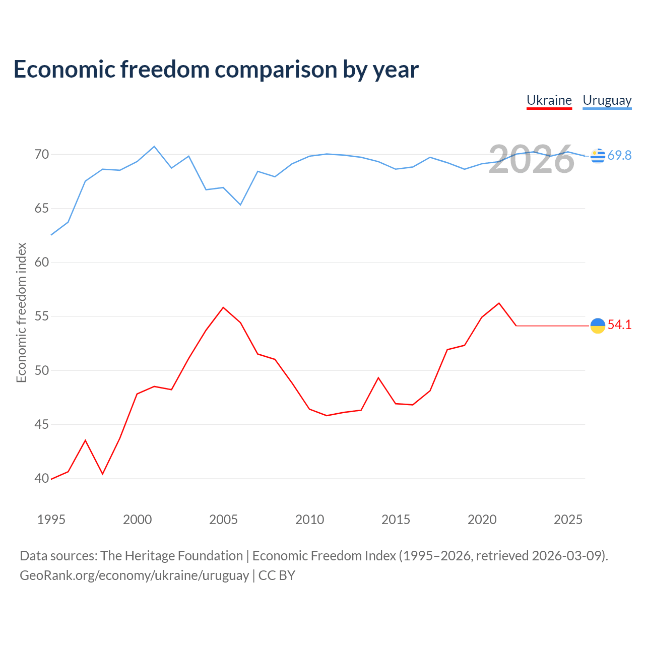 The Economic Freedom Index for Ukraine is 54.1, ranking 135/197, compared to 69.8 for Uruguay, ranking 39/197. The chart above displays a comparison of annual changes in economic freedom indexes.