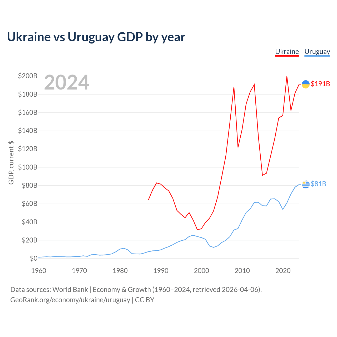 Ukraine has a GDP of $191B compared to $81B for Uruguay, ranking 57/197 and 81/197 by economy size, respectively.