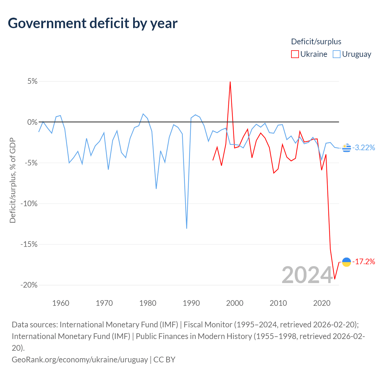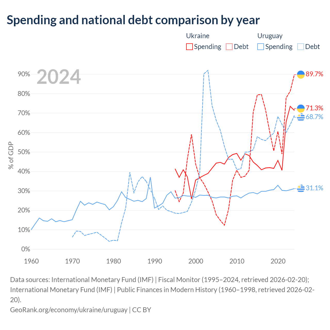 Ukraine has $171B in government debt (89.7% of GDP), compared to $55.6B (68.7% of GDP) in Uruguay.