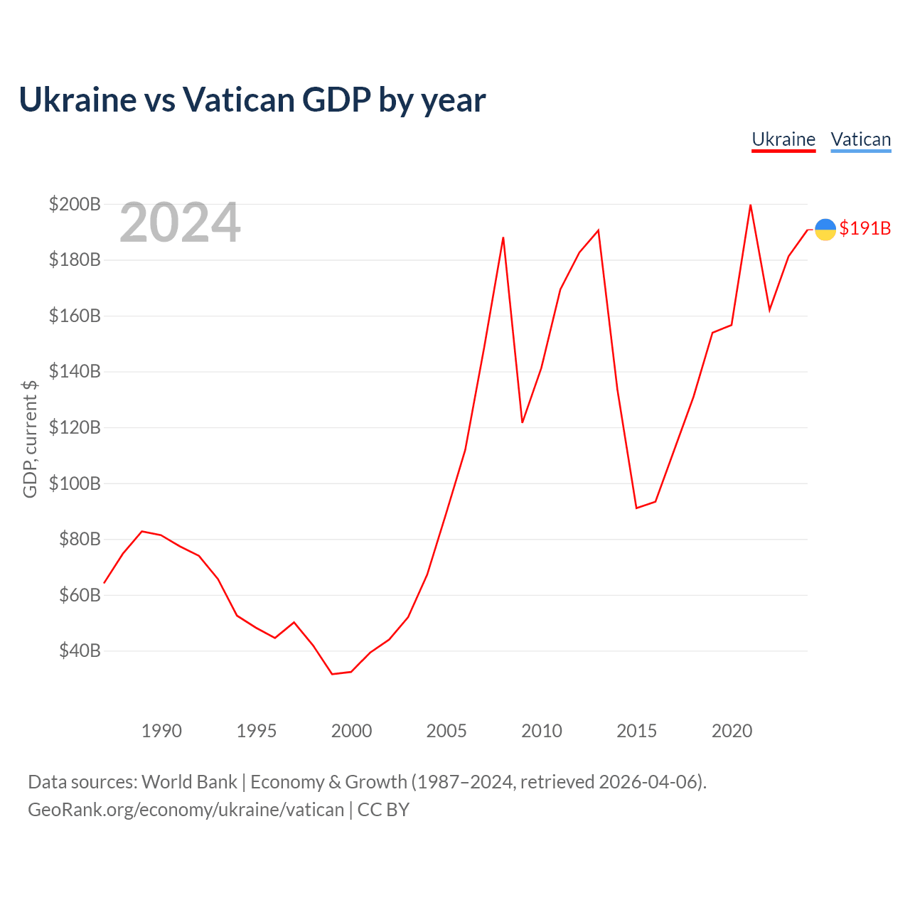 Ukraine has a GDP of $191B compared to $19.8M for the Vatican, ranking 57/197 and 197/197 by economy size, respectively.
