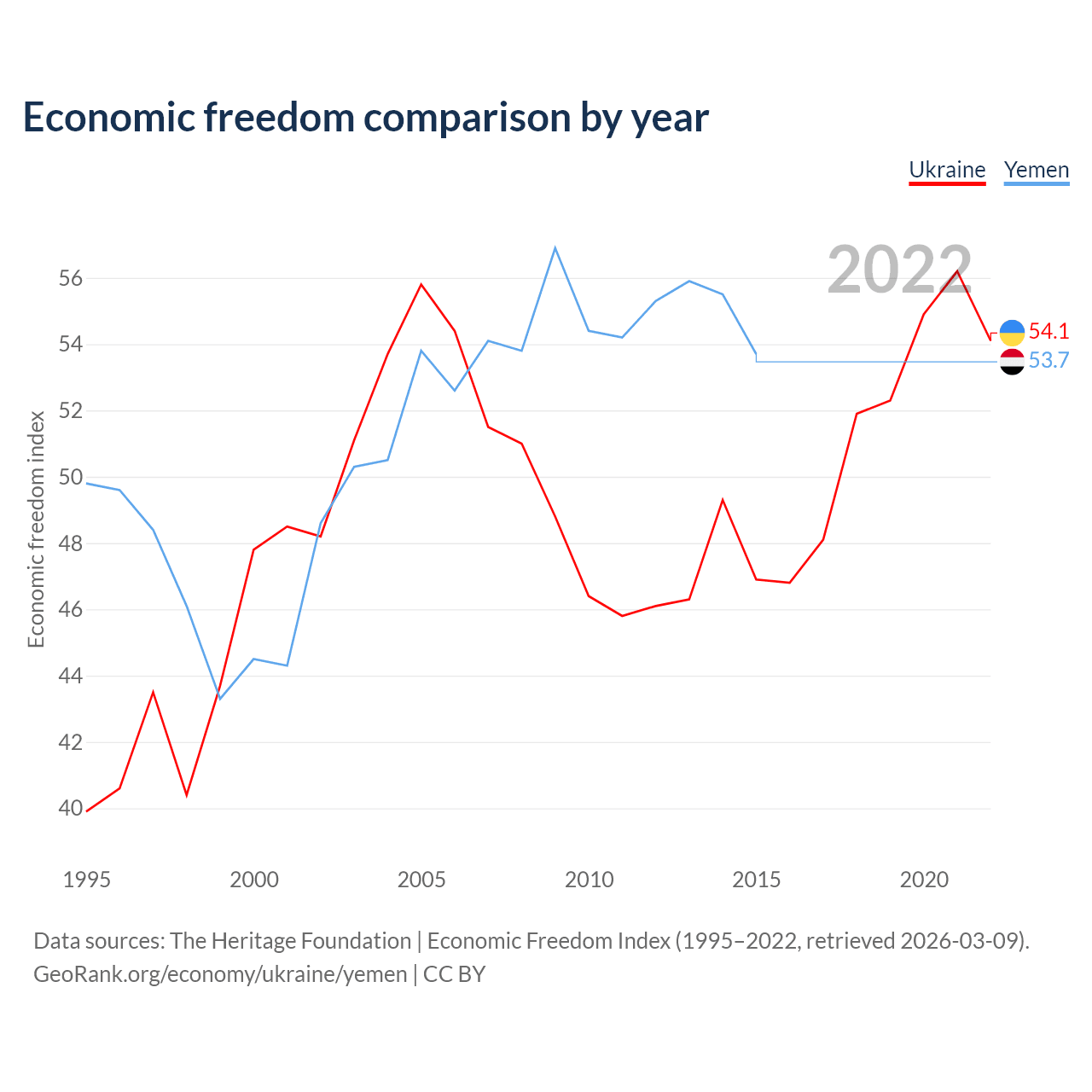 The Economic Freedom Index for Ukraine is 54.1, ranking 135/197, compared to 53.7 for Yemen, ranking 138/197. The chart above displays a comparison of annual changes in economic freedom indexes.