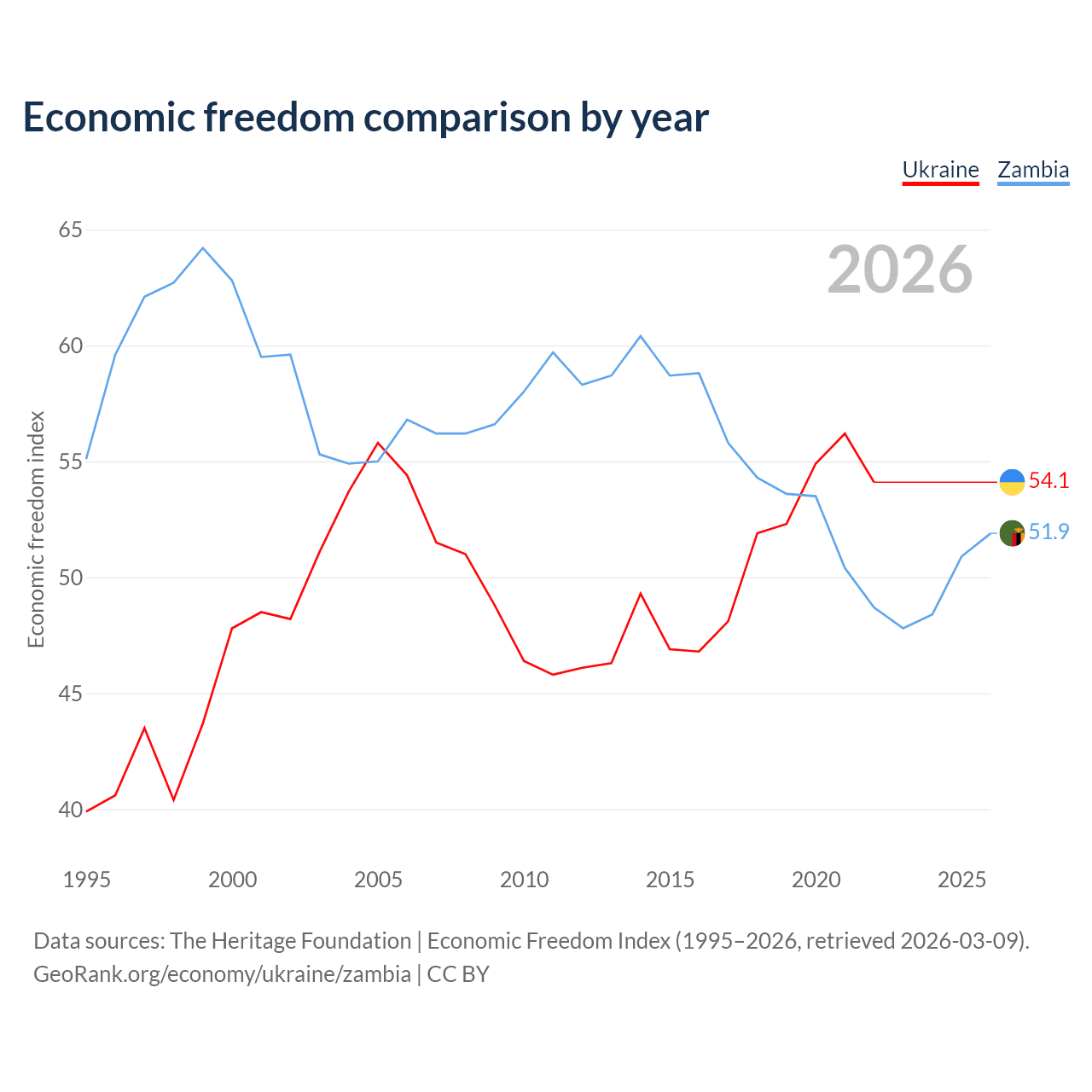 The Economic Freedom Index for Ukraine is 54.1, ranking 135/197, compared to 51.9 for Zambia, ranking 152/197. The chart above displays a comparison of annual changes in economic freedom indexes.
