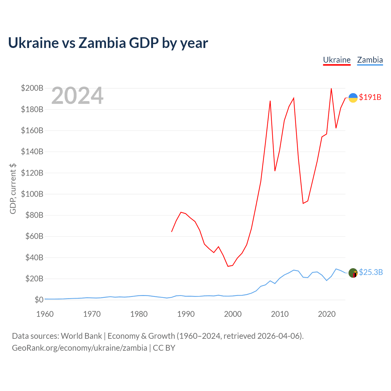 Ukraine has a GDP of $191B compared to $25.3B for Zambia, ranking 57/197 and 116/197 by economy size, respectively.