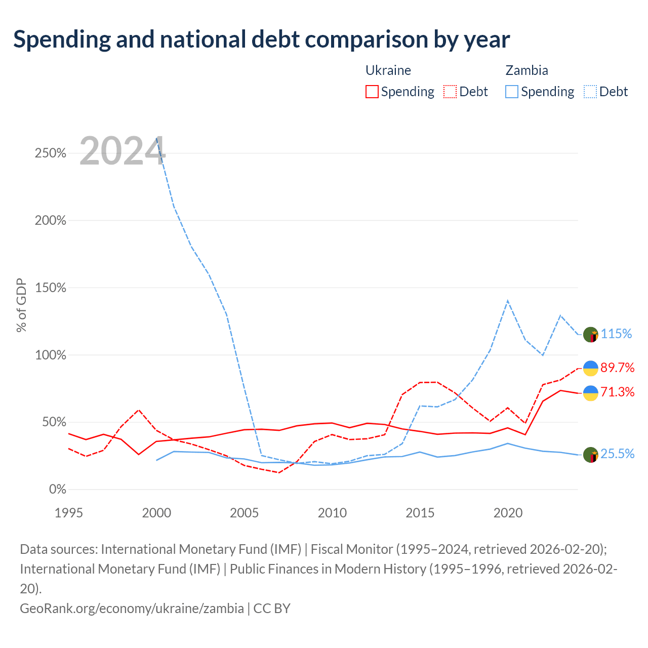 Ukraine has $171B in government debt (89.7% of GDP), compared to $29.1B (114.9% of GDP) in Zambia.