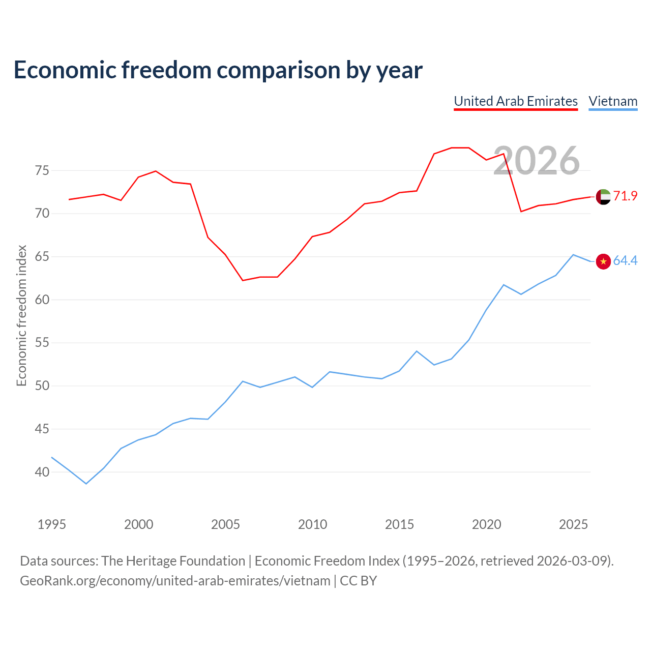 Data sources: The Heritage Foundation | Economic Freedom Index (1995–2026, retrieved 2026-03-09).