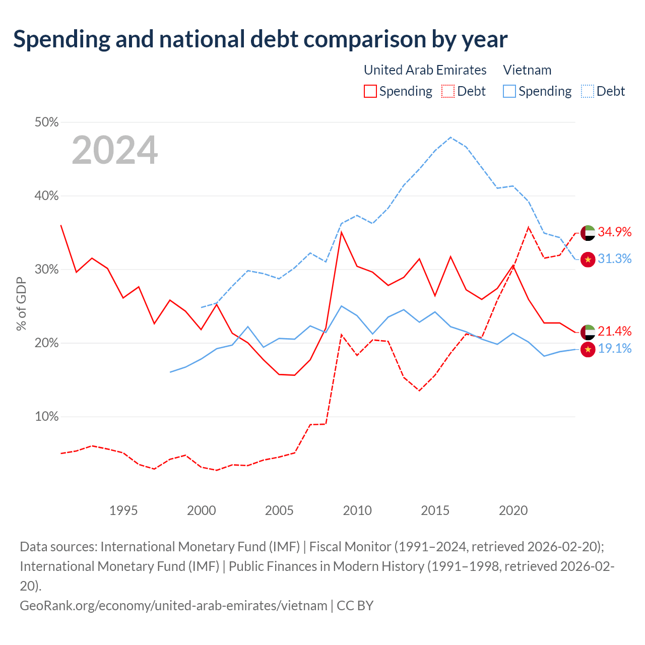 The United Arab Emirates has $193B in government debt (34.9% of GDP), compared to $149B (31.3% of GDP) in Vietnam.