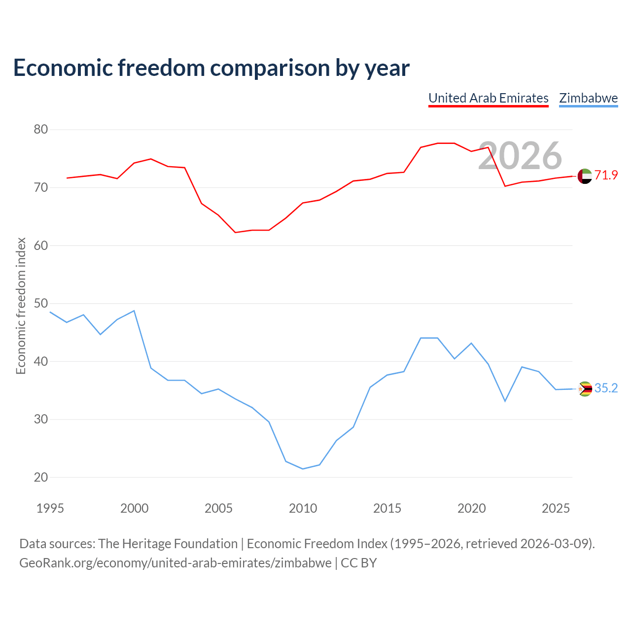 The Economic Freedom Index for the United Arab Emirates is 71.9, ranking 29/197, compared to 35.2 for Zimbabwe, ranking 190/197. The chart above displays a comparison of annual changes in economic freedom indexes.