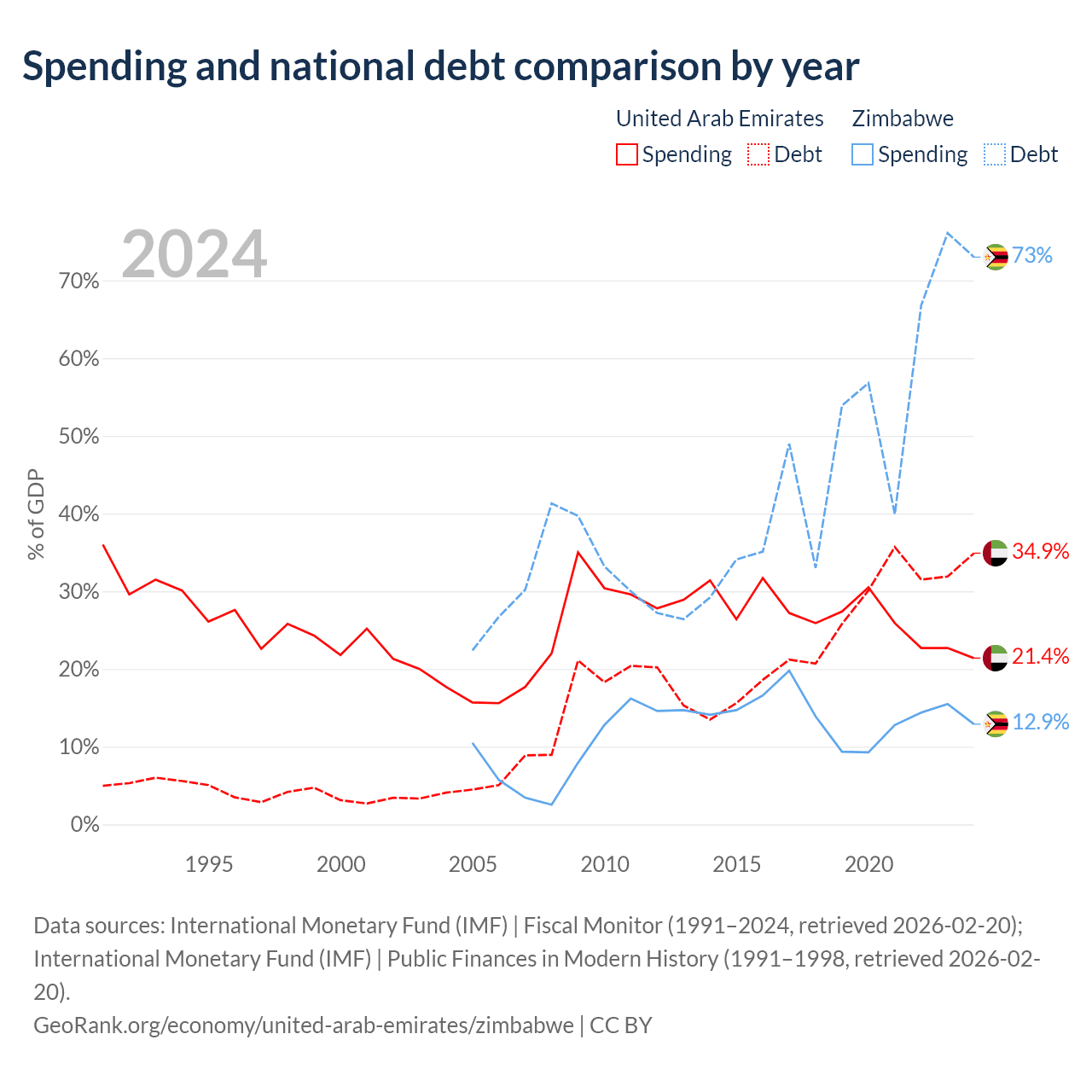 The United Arab Emirates has $193B in government debt (34.9% of GDP), compared to $30.3B (73% of GDP) in Zimbabwe.