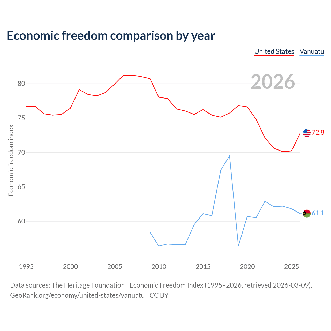 The Economic Freedom Index for the United States is 72.8, ranking 27/197, compared to 61.1 for Vanuatu, ranking 92/197. The chart above displays a comparison of annual changes in economic freedom indexes.