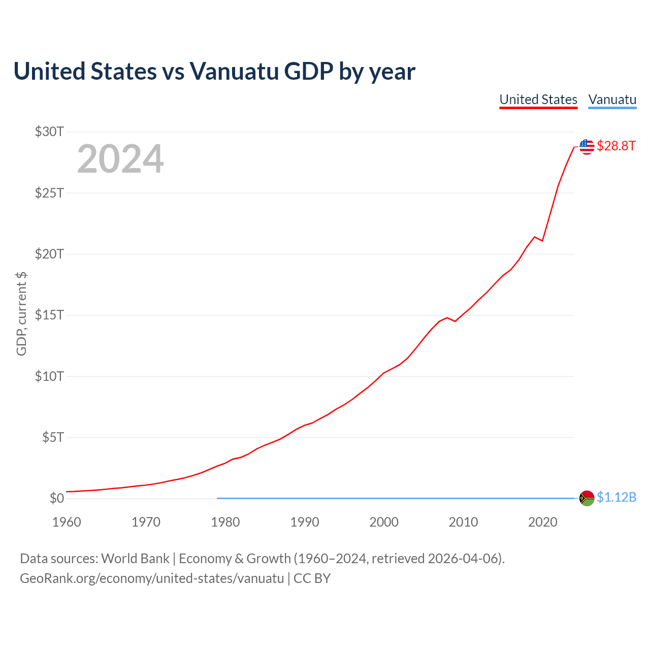 The United States has a GDP of $28.8T compared to $1.12B for Vanuatu, ranking 1/197 and 188/197 by economy size, respectively.