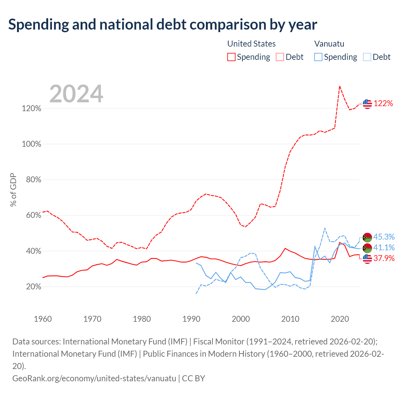 The United States has $35.2T in government debt (122.3% of GDP), compared to $507M (45.3% of GDP) in Vanuatu.