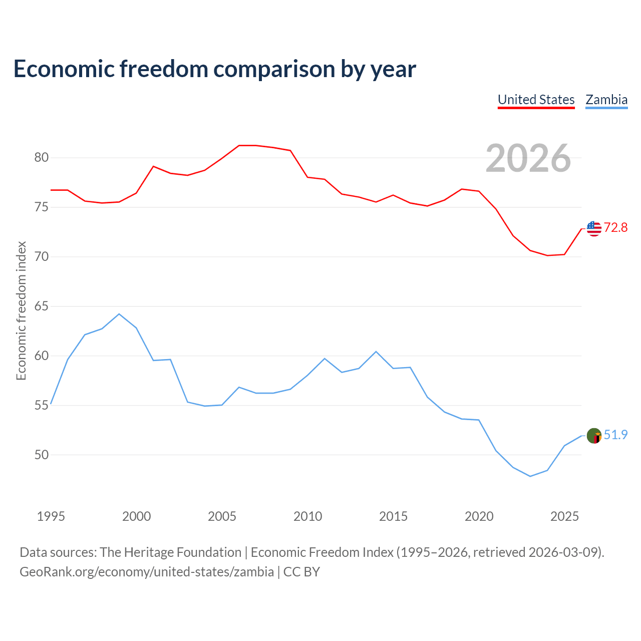 The Economic Freedom Index for the United States is 72.8, ranking 27/197, compared to 51.9 for Zambia, ranking 152/197. The chart above displays a comparison of annual changes in economic freedom indexes.