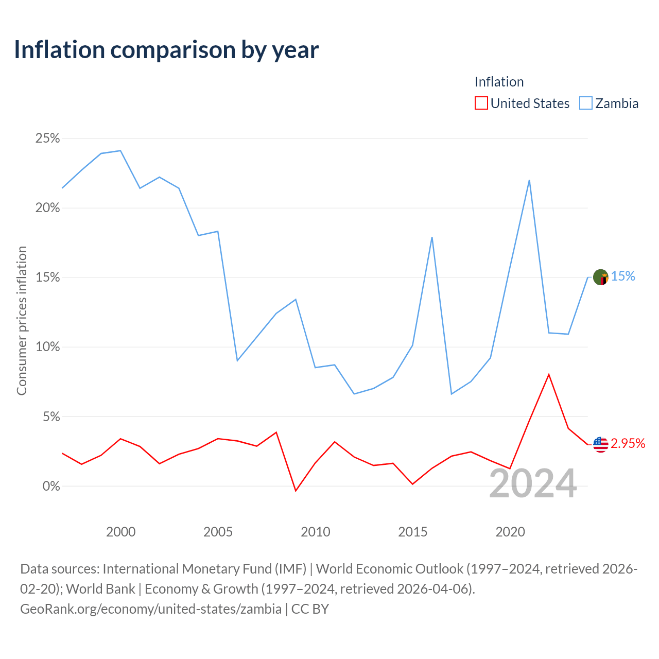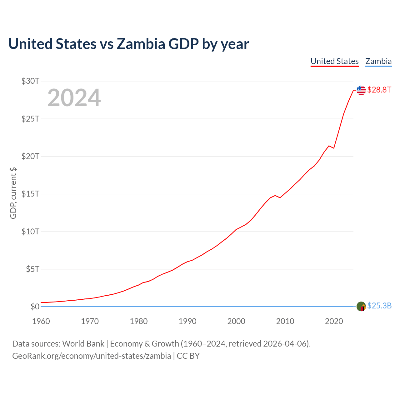 The United States has a GDP of $28.8T compared to $25.3B for Zambia, ranking 1/197 and 116/197 by economy size, respectively.