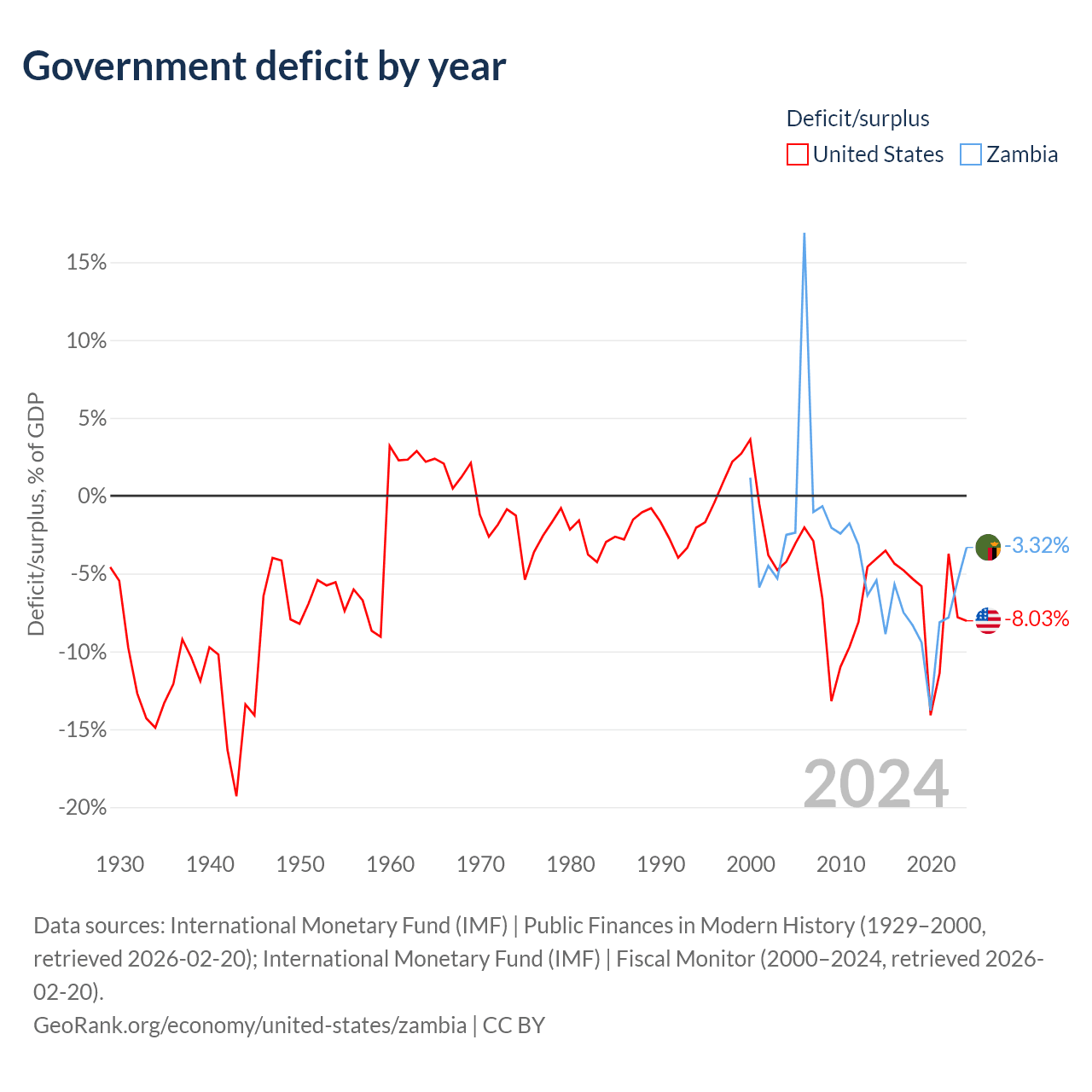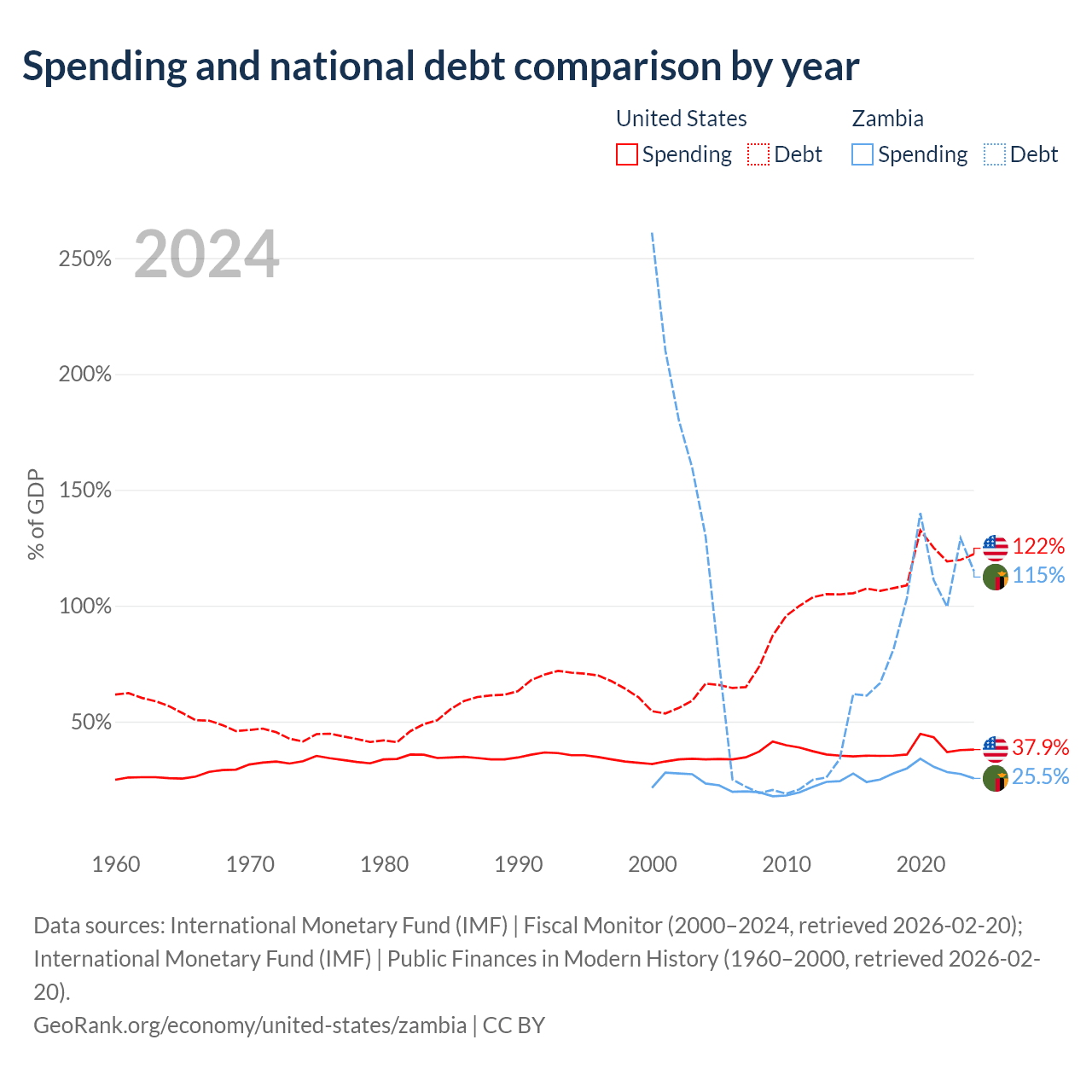The United States has $35.2T in government debt (122.3% of GDP), compared to $29.1B (114.9% of GDP) in Zambia.