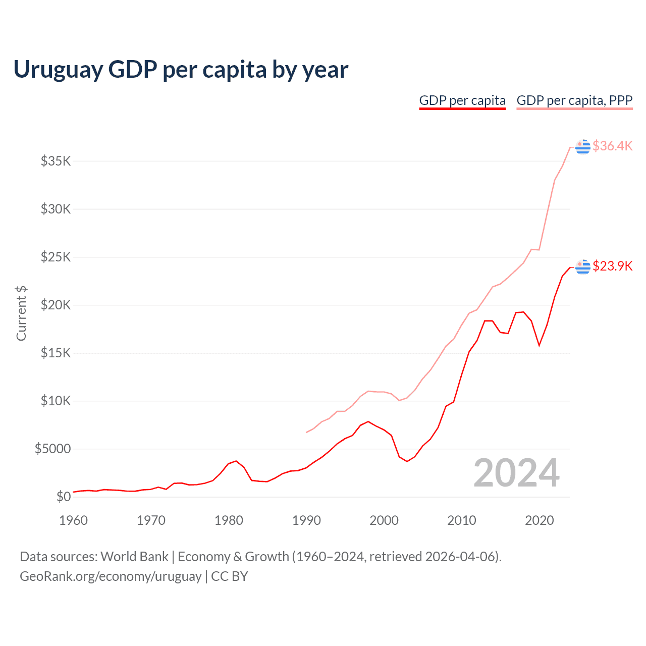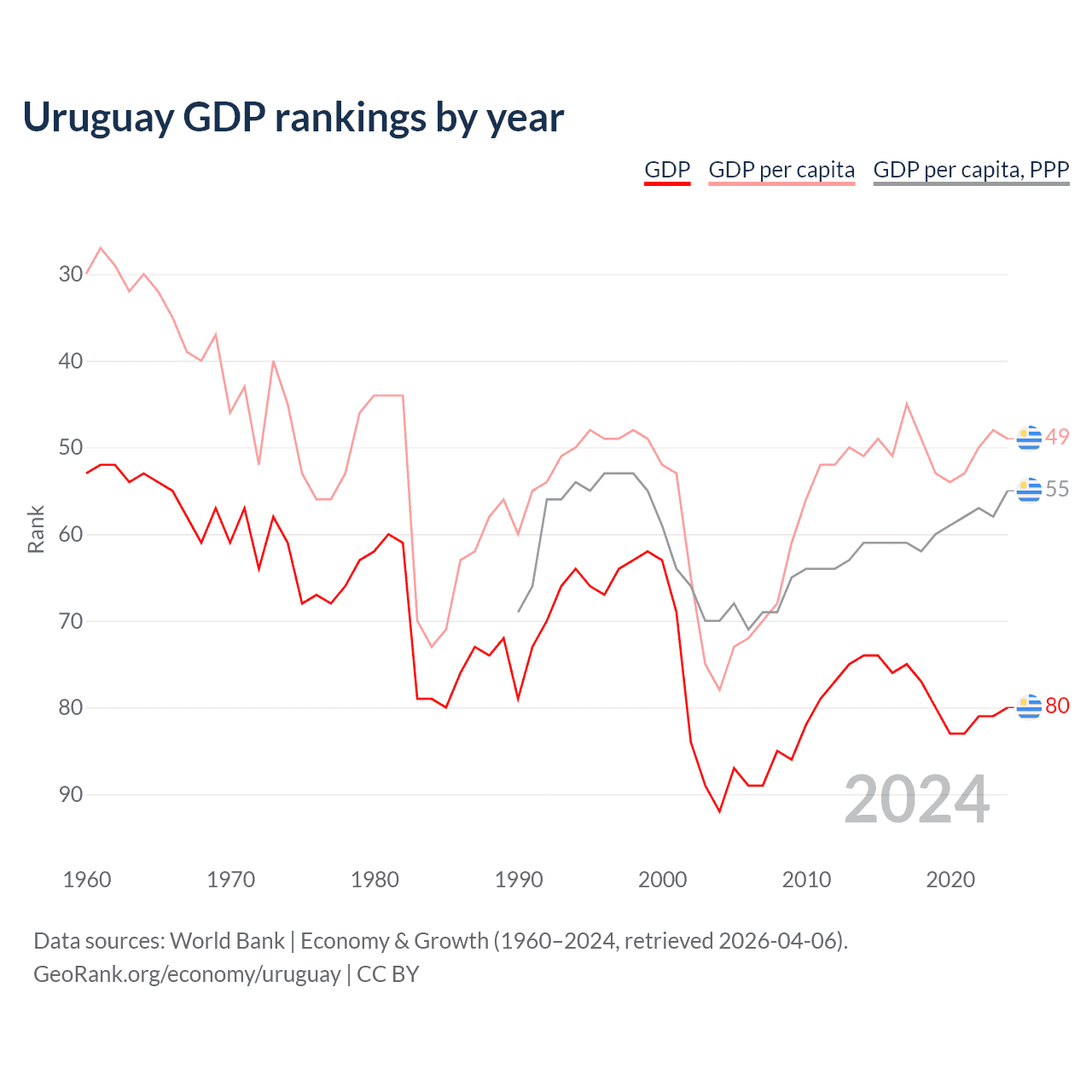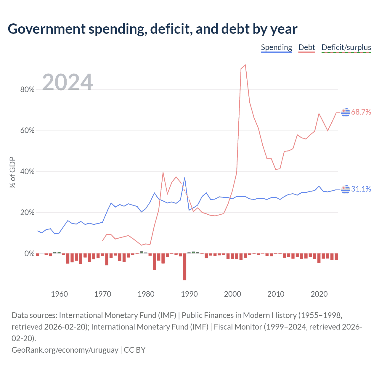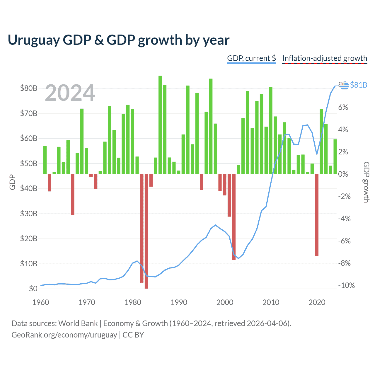 Uruguay ranked 81/197 by economy size with a GDP of $81B and 52/197 by GDP per capita at $23,907. Uruguay has $55.6B in government debt, with a debt-to-GDP ratio of 68.7%.