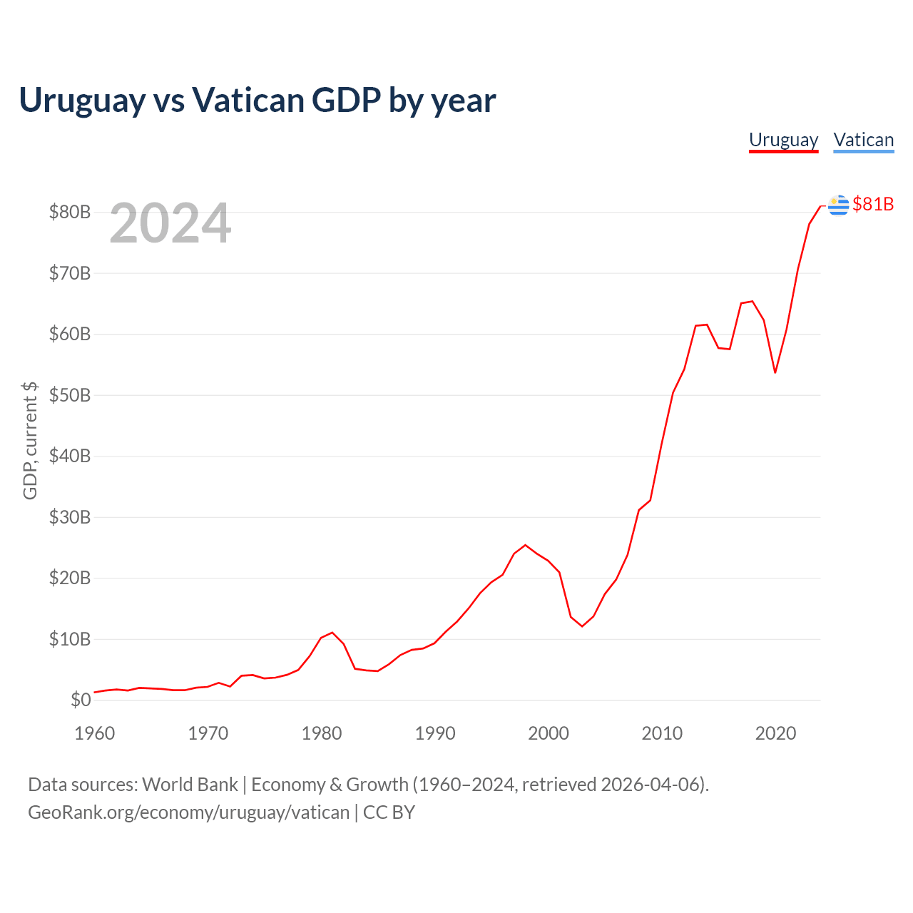 Uruguay has a GDP of $81B compared to $19.8M for the Vatican, ranking 81/197 and 197/197 by economy size, respectively.