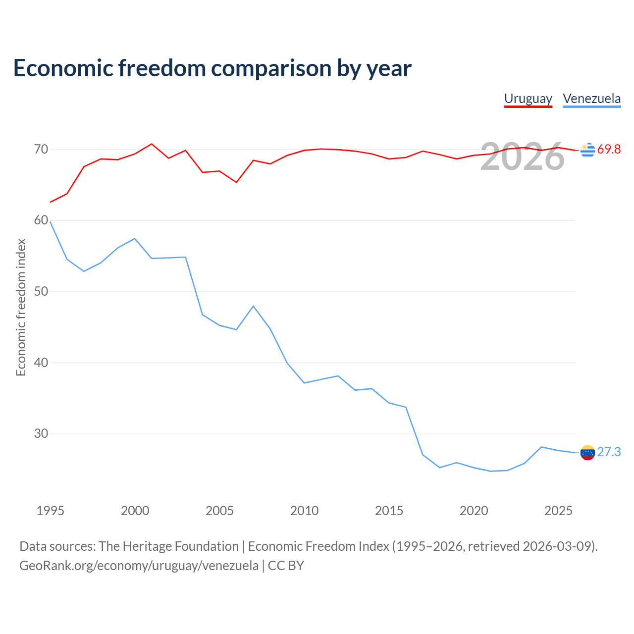 The Economic Freedom Index for Uruguay is 69.8, ranking 39/197, compared to 27.3 for Venezuela, ranking 194/197. The chart above displays a comparison of annual changes in economic freedom indexes.