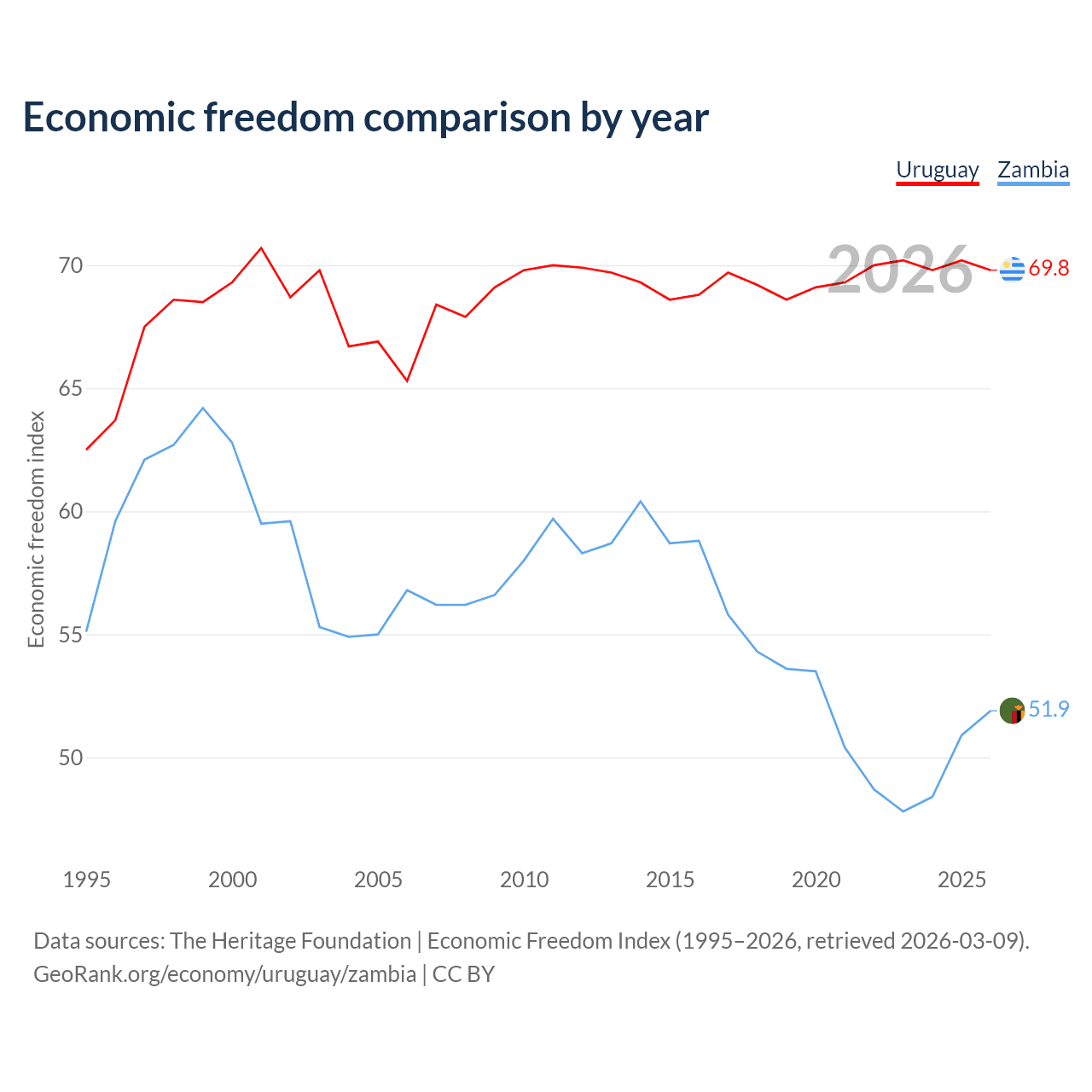 The Economic Freedom Index for Uruguay is 69.8, ranking 39/197, compared to 51.9 for Zambia, ranking 152/197. The chart above displays a comparison of annual changes in economic freedom indexes.