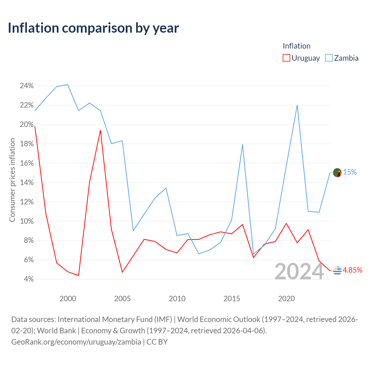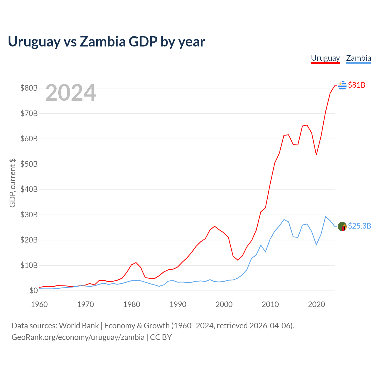 Uruguay has a GDP of $81B compared to $25.3B for Zambia, ranking 81/197 and 116/197 by economy size, respectively.