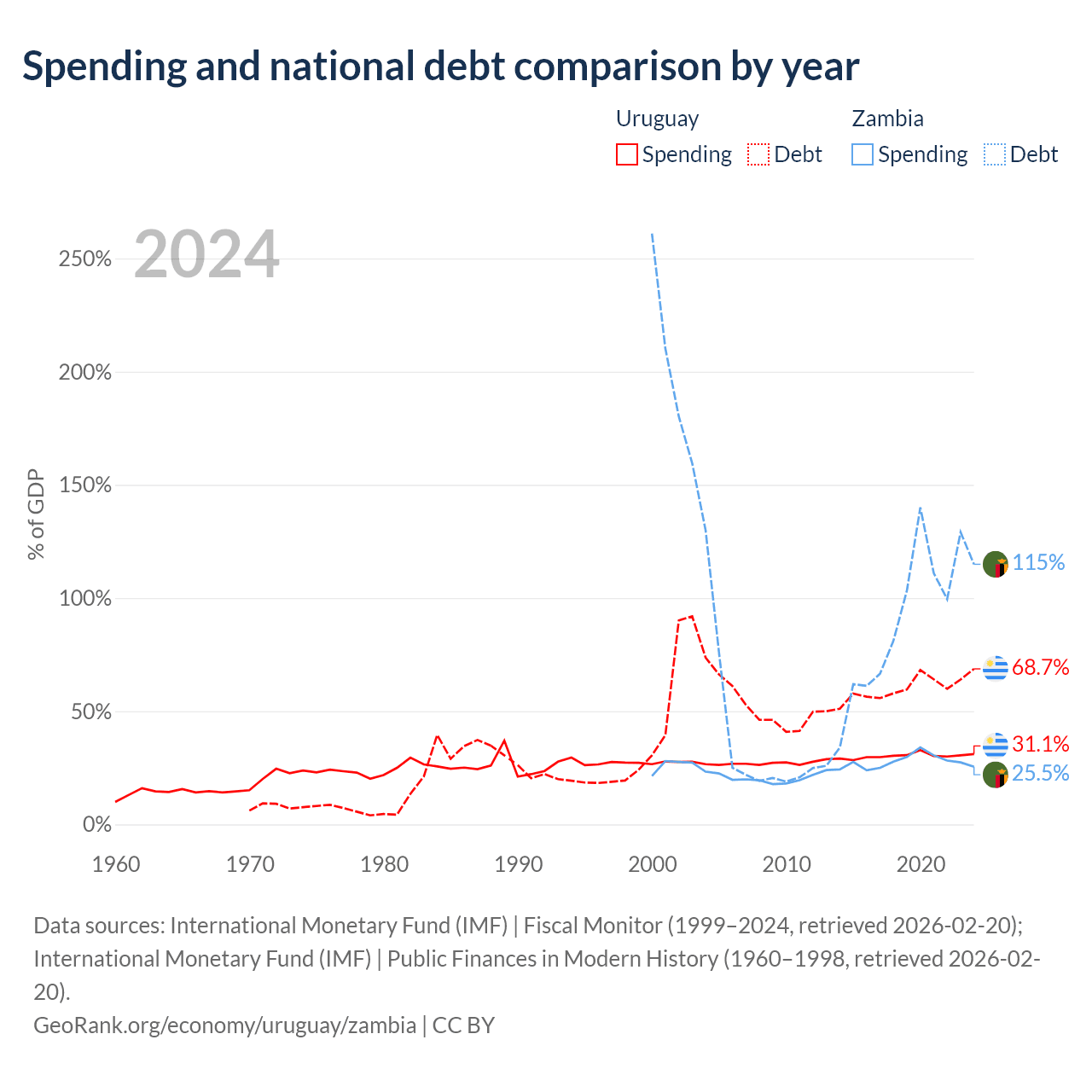 Uruguay has $55.6B in government debt (68.7% of GDP), compared to $29.1B (114.9% of GDP) in Zambia.