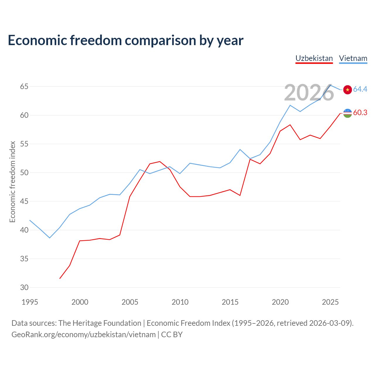 The Economic Freedom Index for Uzbekistan is 60.3, ranking 94/197, compared to 64.4 for Vietnam, ranking 73/197. The chart above displays a comparison of annual changes in economic freedom indexes.