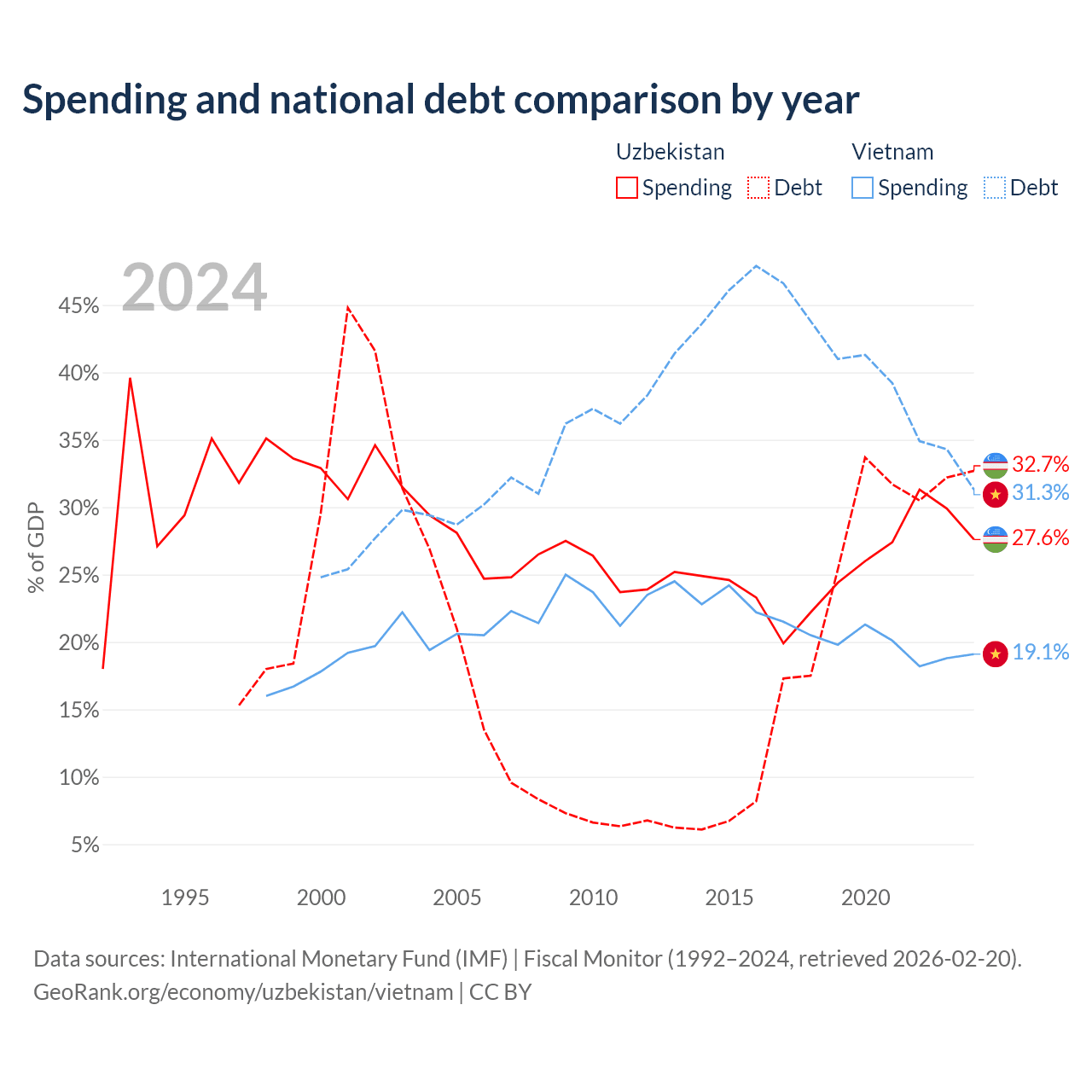Uzbekistan has $37.5B in government debt (32.7% of GDP), compared to $149B (31.3% of GDP) in Vietnam.