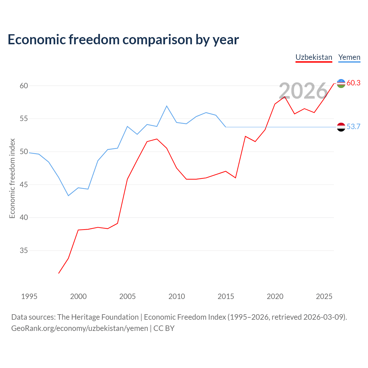 The Economic Freedom Index for Uzbekistan is 60.3, ranking 94/197, compared to 53.7 for Yemen, ranking 138/197. The chart above displays a comparison of annual changes in economic freedom indexes.