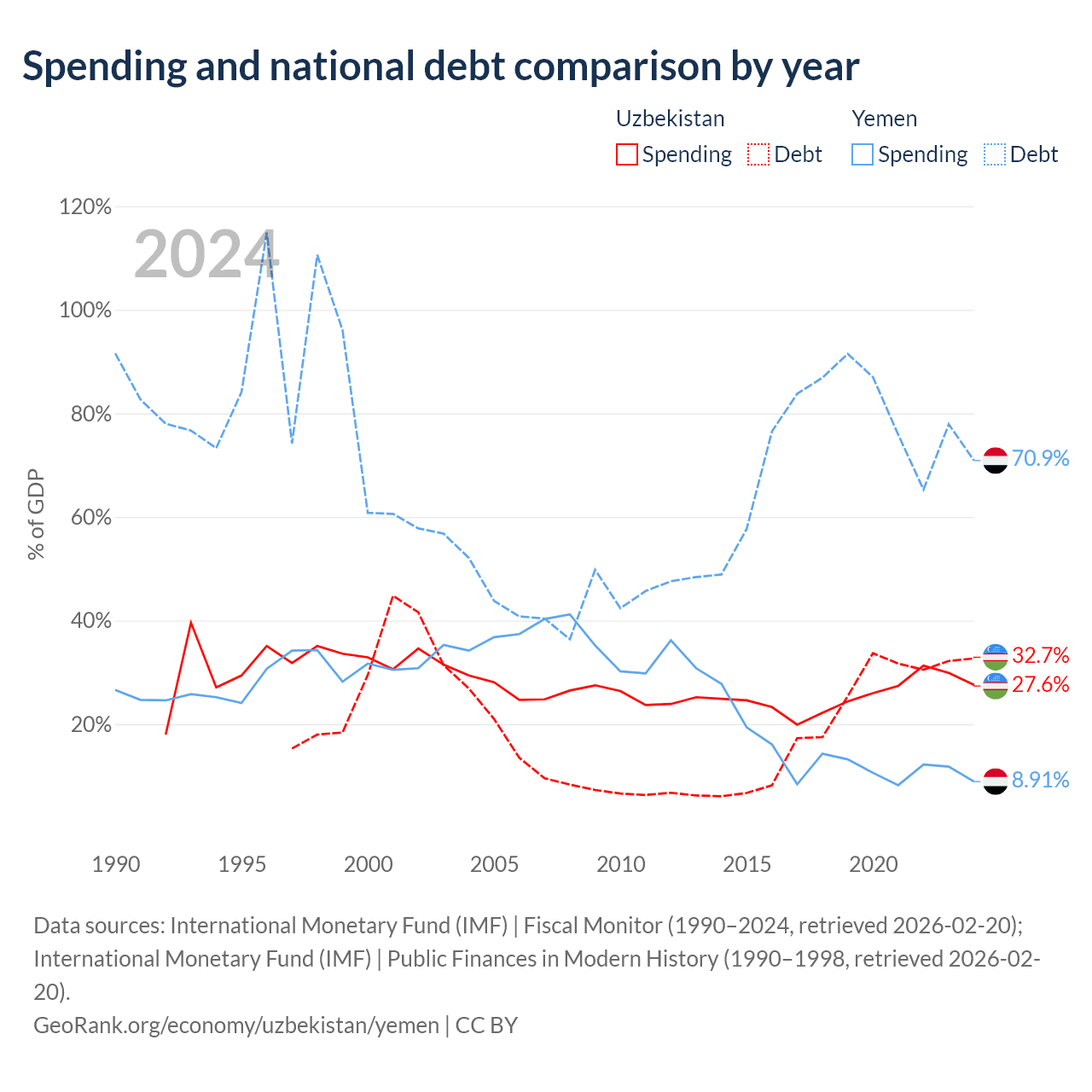 Uzbekistan has $37.5B in government debt (32.7% of GDP), compared to $18.8B (70.9% of GDP) in Yemen.