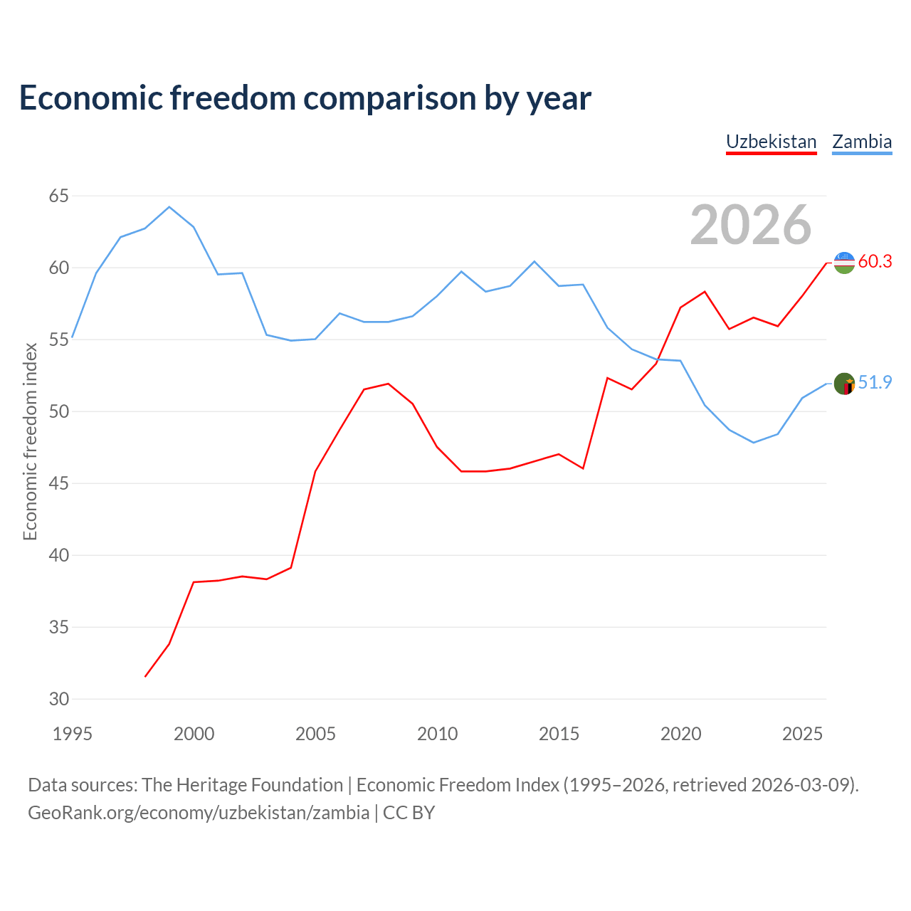 The Economic Freedom Index for Uzbekistan is 60.3, ranking 94/197, compared to 51.9 for Zambia, ranking 152/197. The chart above displays a comparison of annual changes in economic freedom indexes.