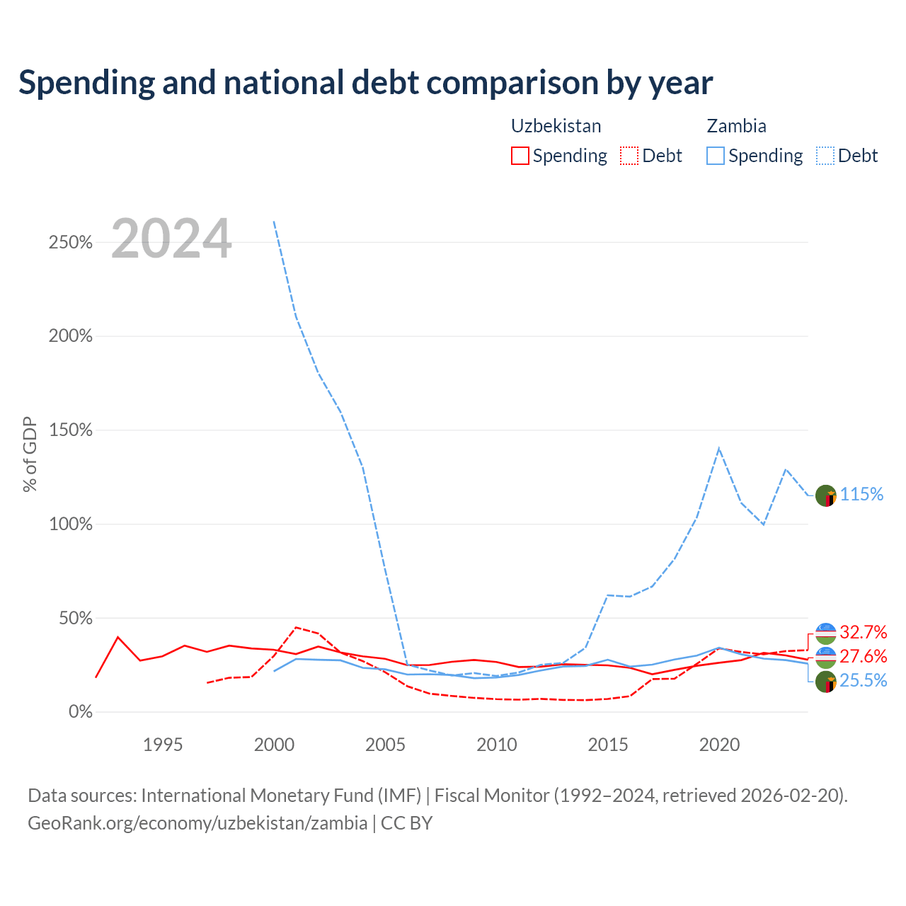 Uzbekistan has $37.5B in government debt (32.7% of GDP), compared to $29.1B (114.9% of GDP) in Zambia.