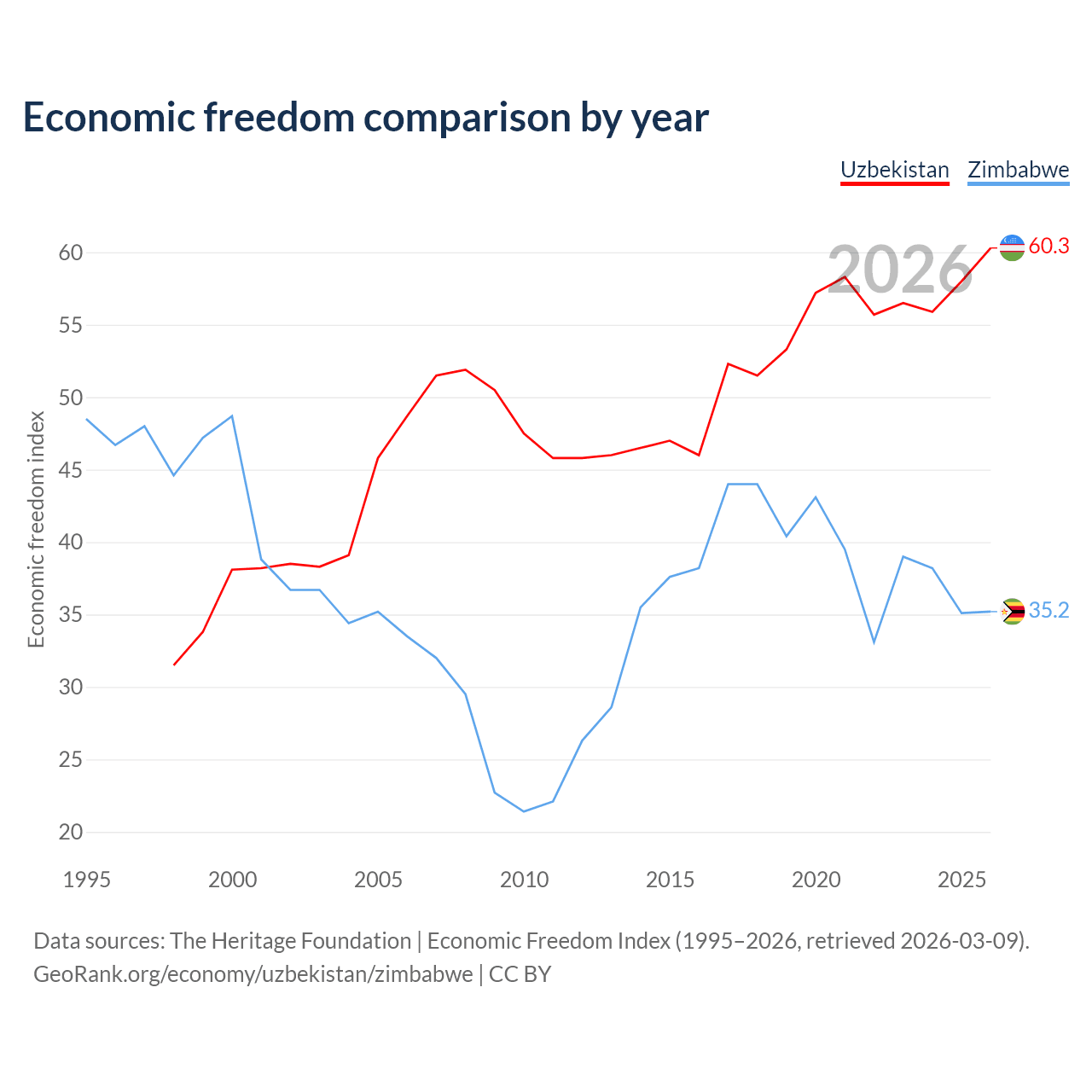 The Economic Freedom Index for Uzbekistan is 60.3, ranking 94/197, compared to 35.2 for Zimbabwe, ranking 190/197. The chart above displays a comparison of annual changes in economic freedom indexes.