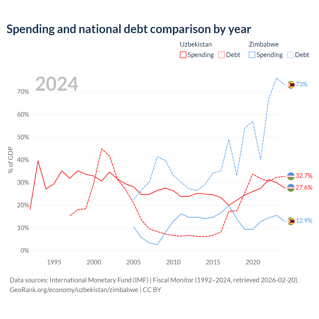 Uzbekistan has $37.5B in government debt (32.7% of GDP), compared to $30.3B (73% of GDP) in Zimbabwe.