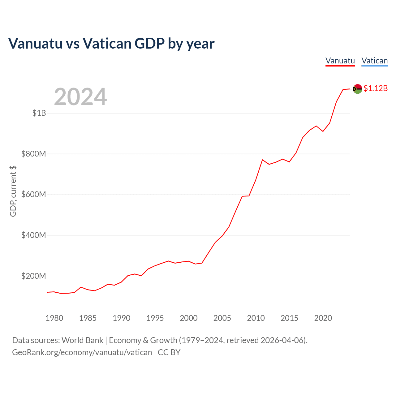 Vanuatu has a GDP of $1.12B compared to $19.8M for the Vatican, ranking 188/197 and 197/197 by economy size, respectively.