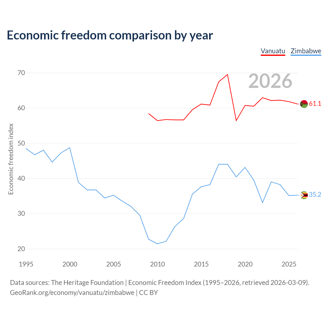 The Economic Freedom Index for Vanuatu is 61.1, ranking 92/197, compared to 35.2 for Zimbabwe, ranking 190/197. The chart above displays a comparison of annual changes in economic freedom indexes.