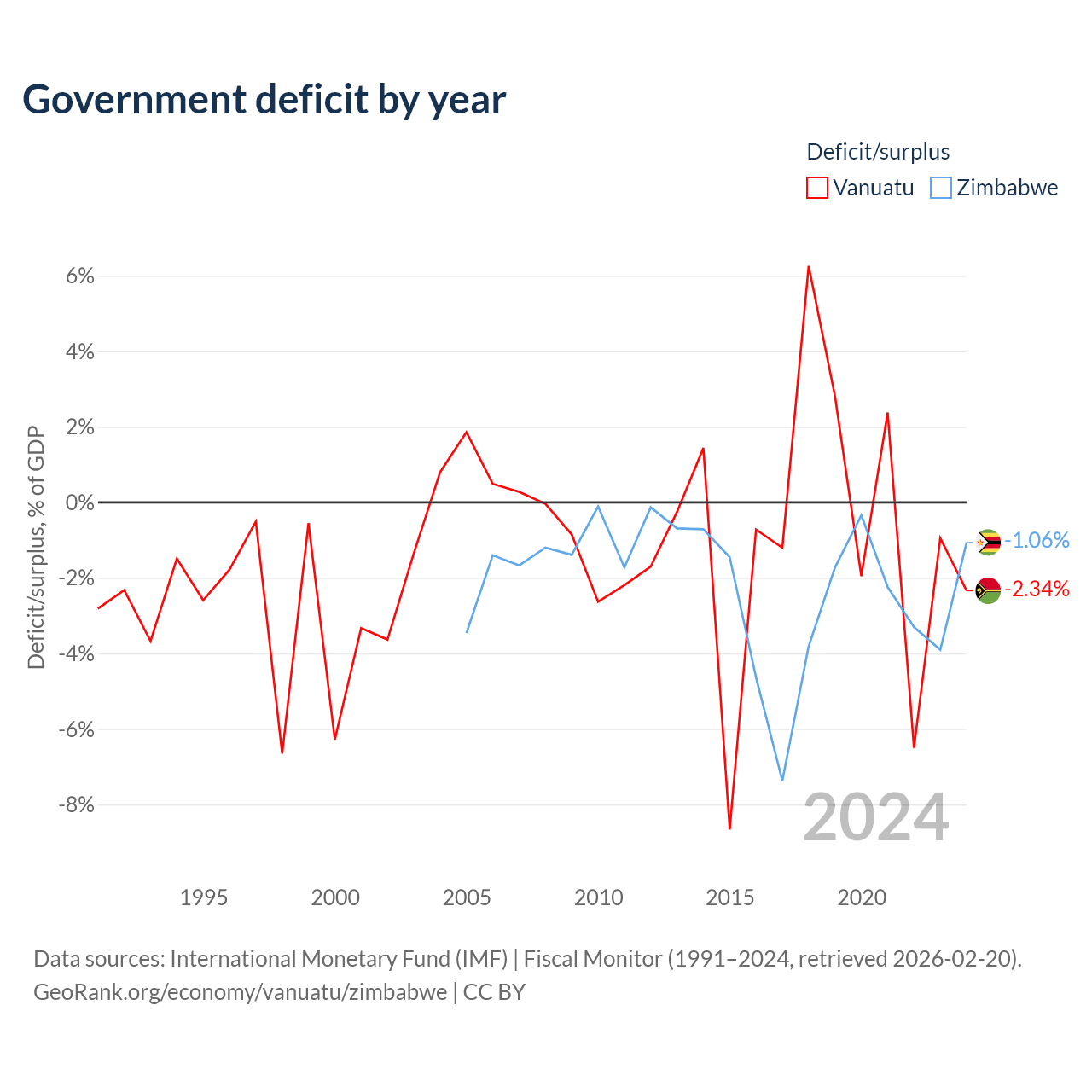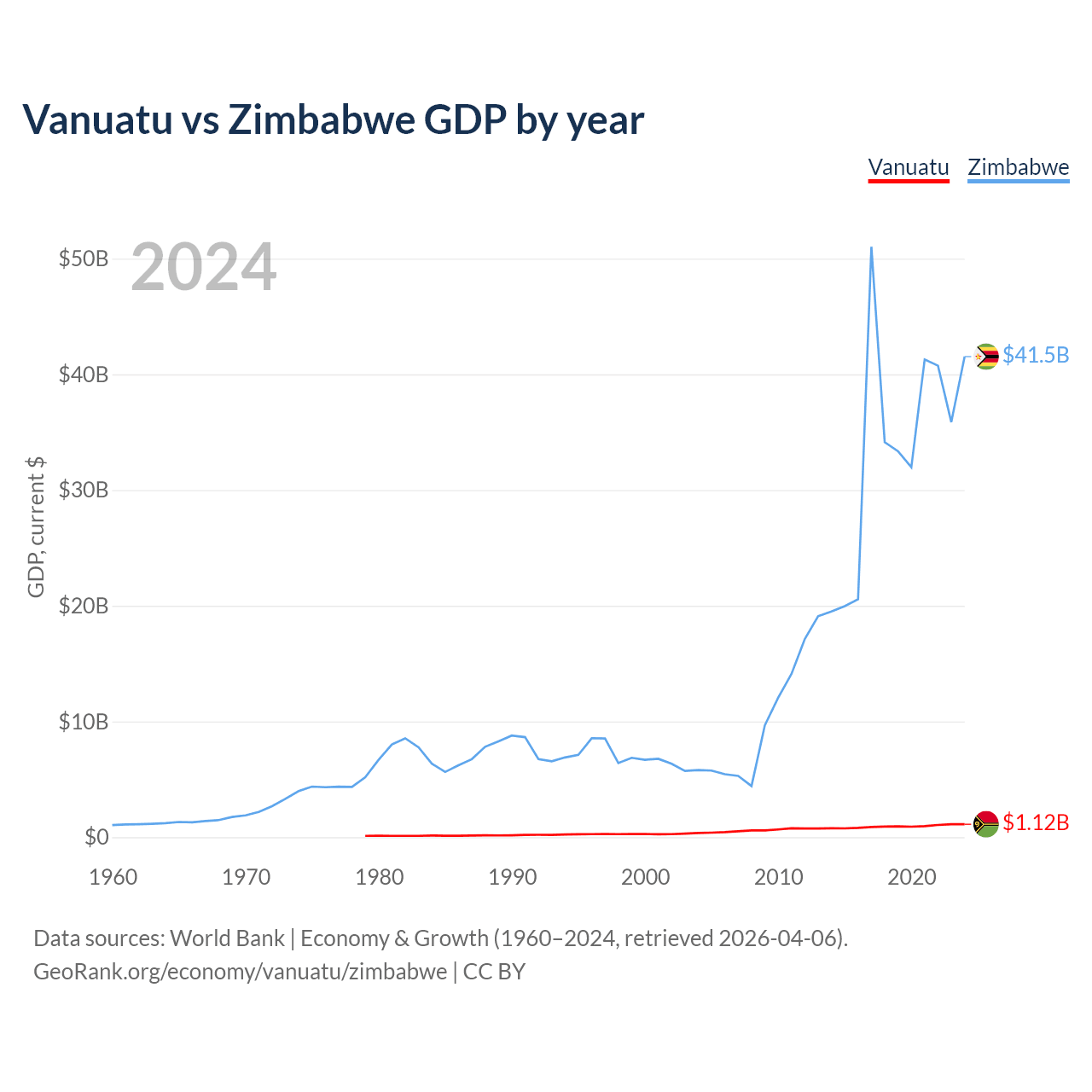 Vanuatu has a GDP of $1.12B compared to $41.5B for Zimbabwe, ranking 188/197 and 102/197 by economy size, respectively.