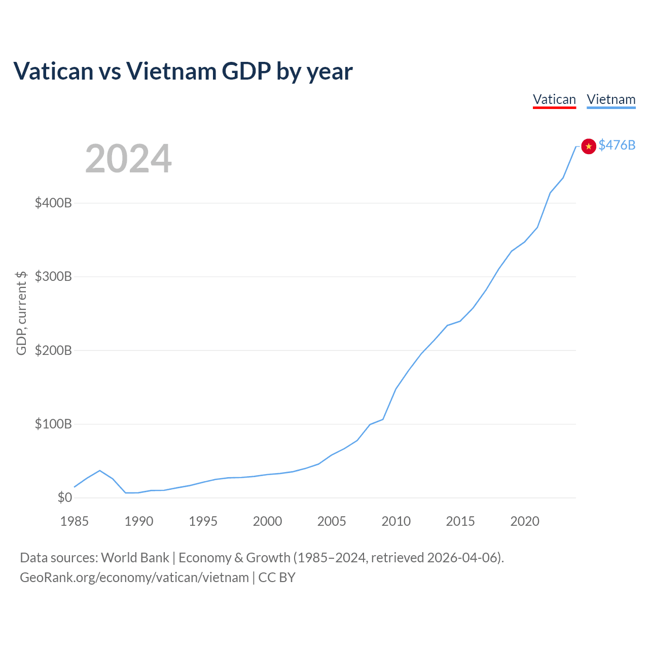 The Vatican has a GDP of $19.8M compared to $476B for Vietnam, ranking 197/197 and 33/197 by economy size, respectively.