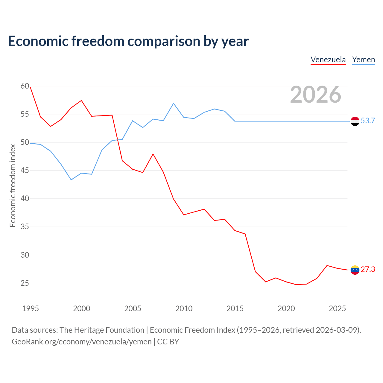 The Economic Freedom Index for Venezuela is 27.3, ranking 194/197, compared to 53.7 for Yemen, ranking 138/197. The chart above displays a comparison of annual changes in economic freedom indexes.