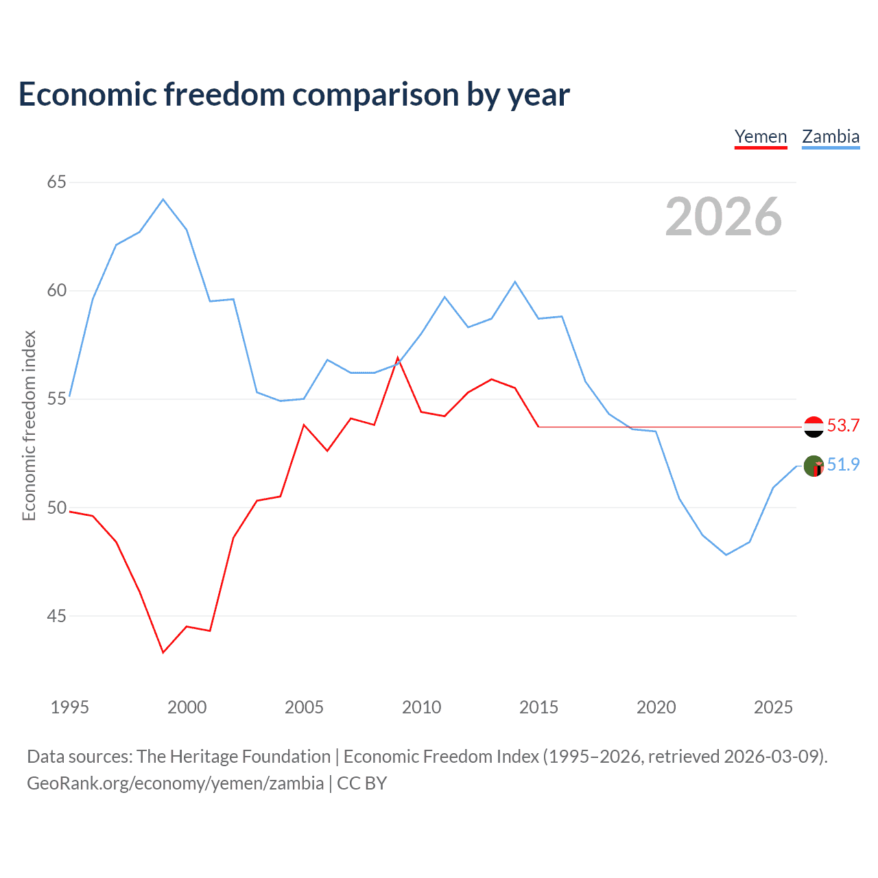 The Economic Freedom Index for Yemen is 53.7, ranking 138/197, compared to 51.9 for Zambia, ranking 152/197. The chart above displays a comparison of annual changes in economic freedom indexes.