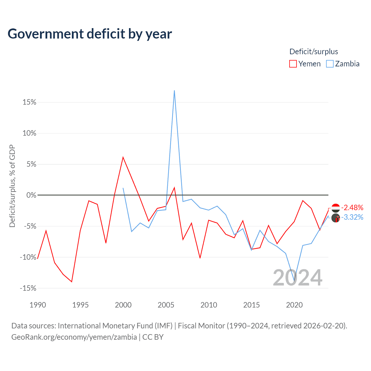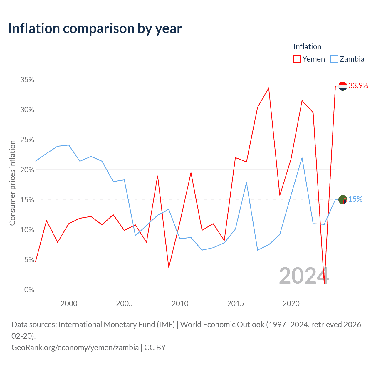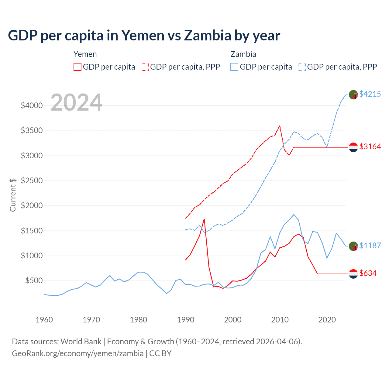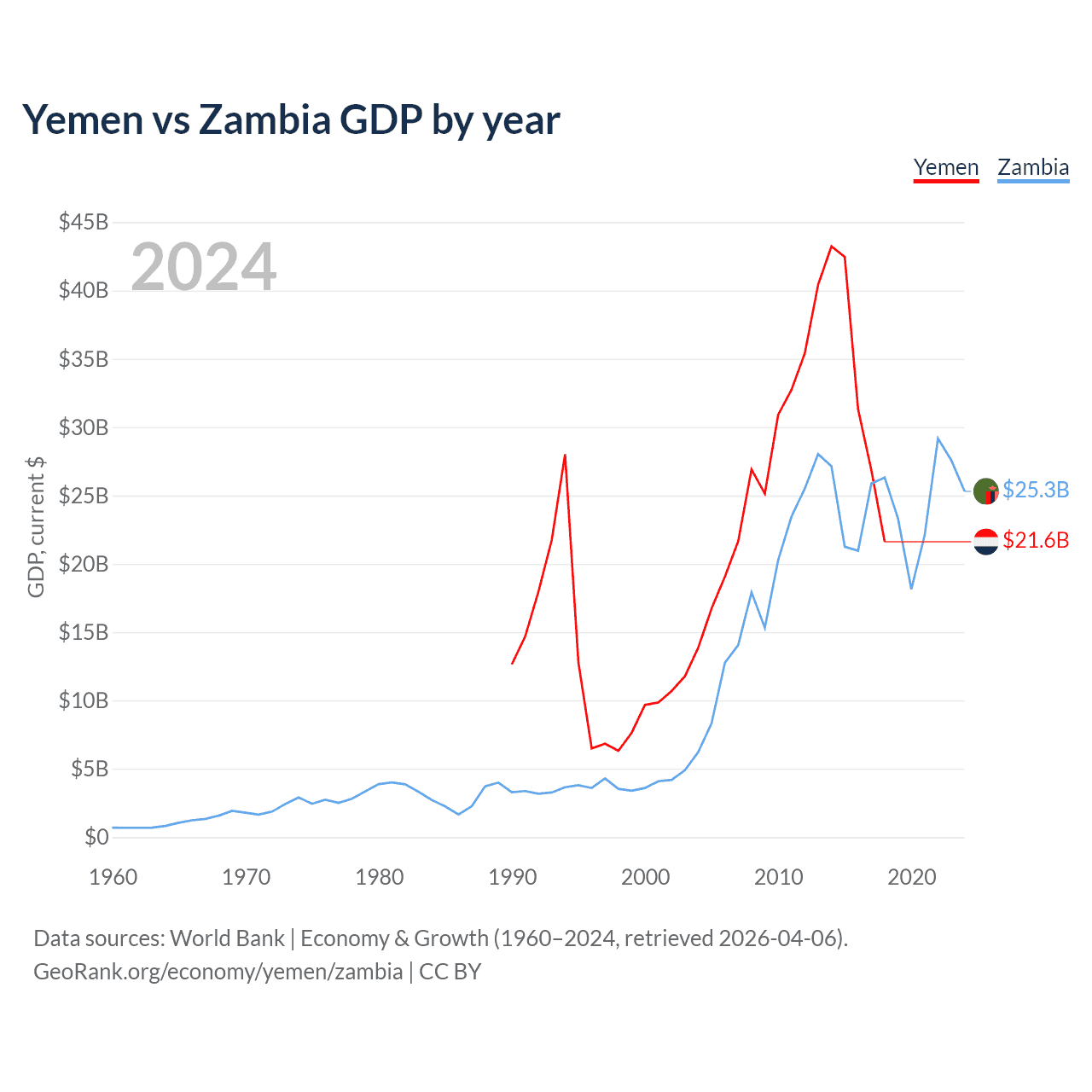 Yemen has a GDP of $21.6B compared to $25.3B for Zambia, ranking 125/197 and 116/197 by economy size, respectively.