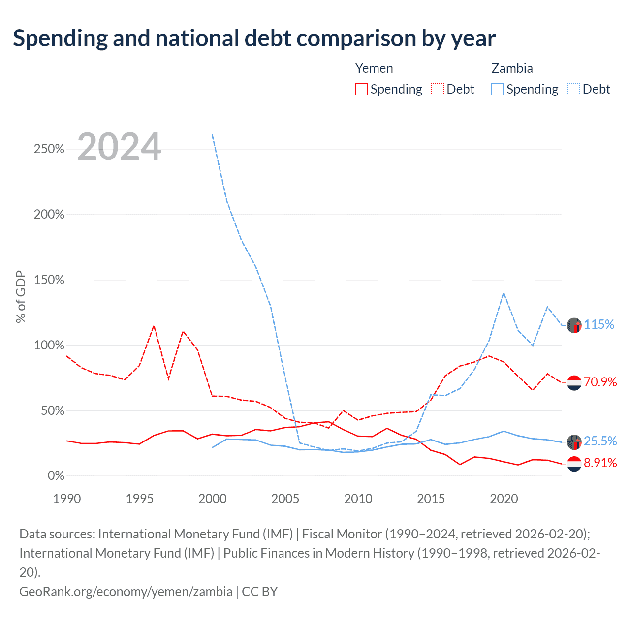 Yemen has $18.8B in government debt (70.9% of GDP), compared to $29.1B (114.9% of GDP) in Zambia.