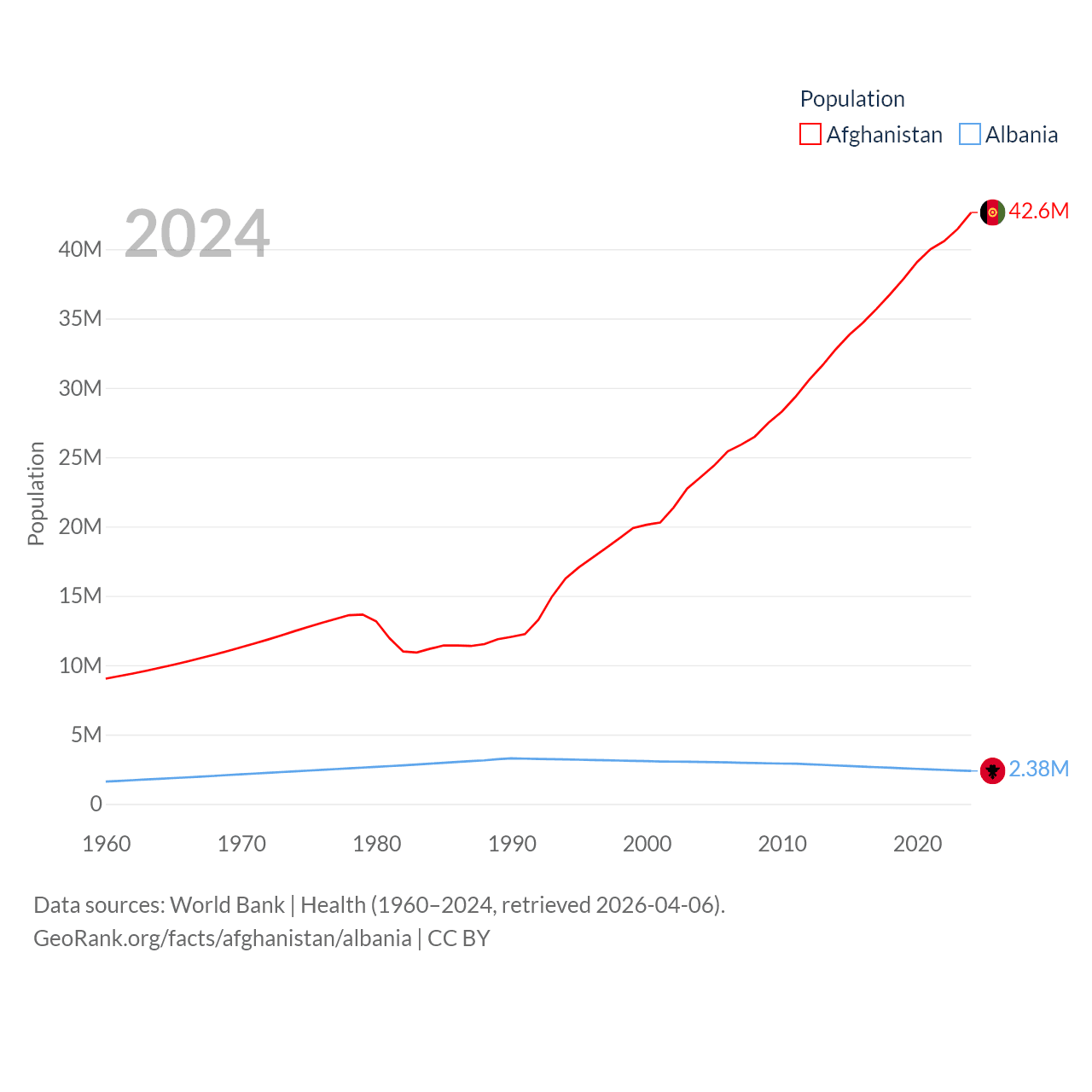 Afghanistan has a population of 42.6M (ranked 36/197), compared with 2.38M in Albania (ranked 144/197). Afghanistan's land area is 251,827 sq mi versus 10,579 sq mi for Albania (ranked 40th vs. 143rd).