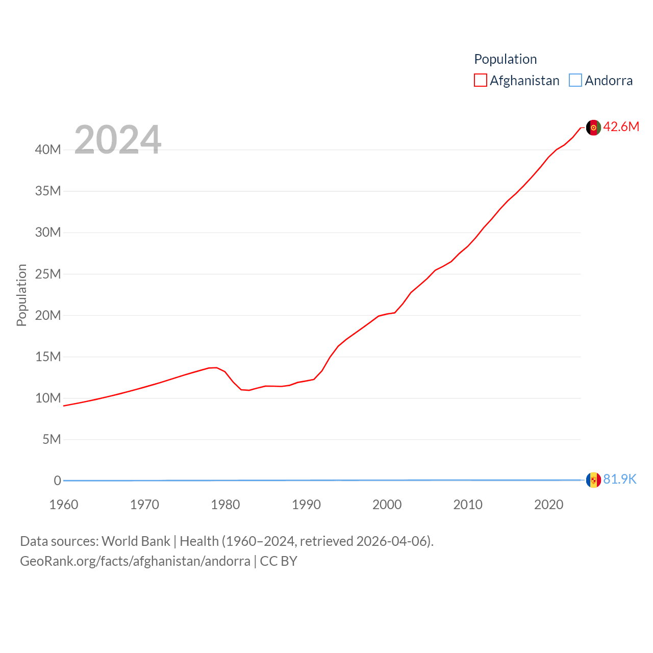 Afghanistan has a population of 42.6M (ranked 36/197), compared with 81.9K in Andorra (ranked 186/197). Afghanistan's land area is 251,827 sq mi versus 181.5 sq mi for Andorra (ranked 40th vs. 179th).