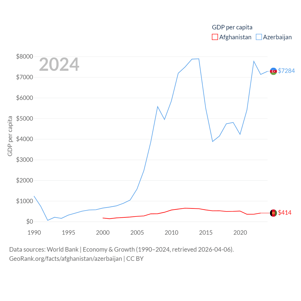 By GDP, Afghanistan ranks 137/197 ($17.2B) and Azerbaijan ranks 84/197 ($74.3B). By GDP per capita, Afghanistan ranks 196/197 ($414), while Azerbaijan ranks 101/197 ($7,284).