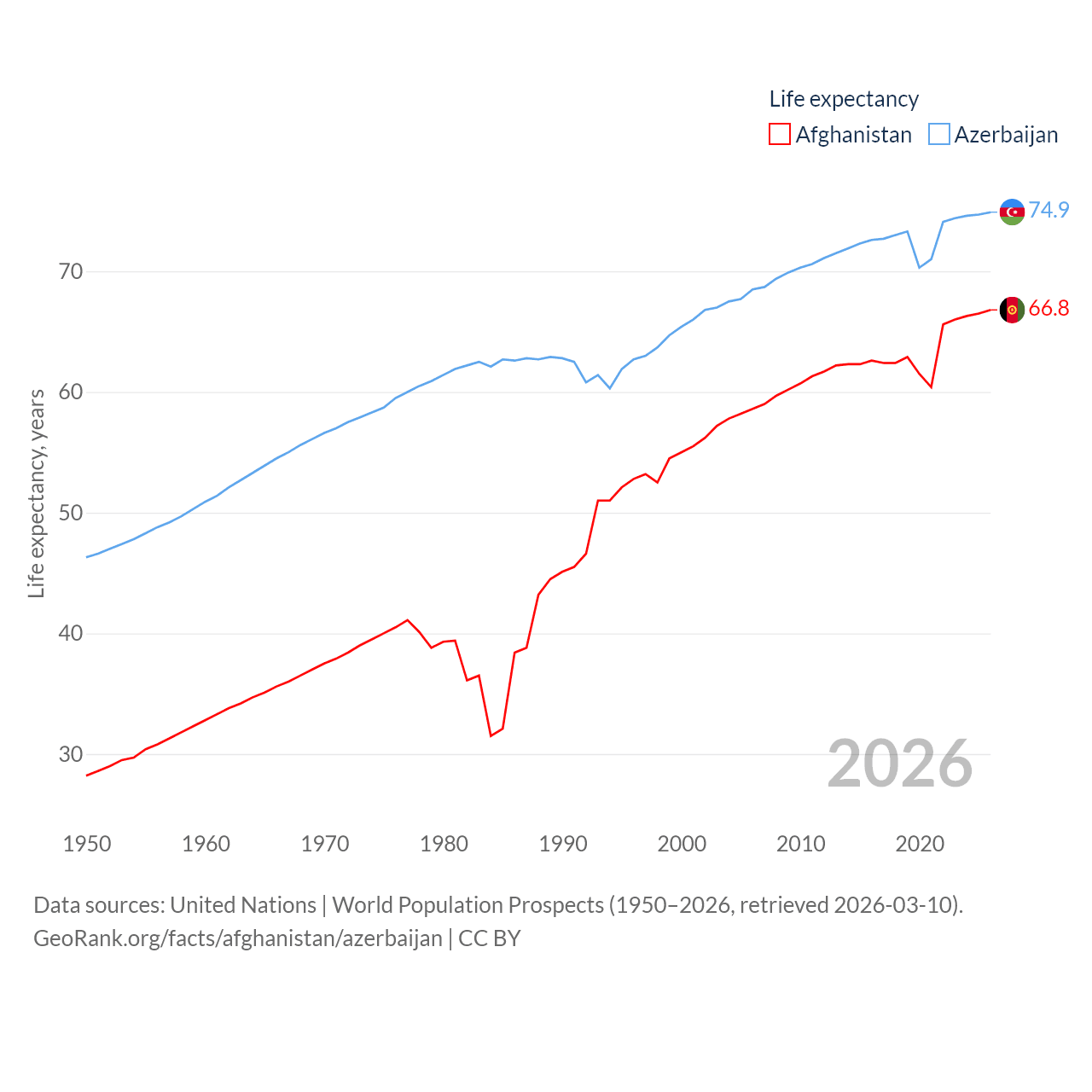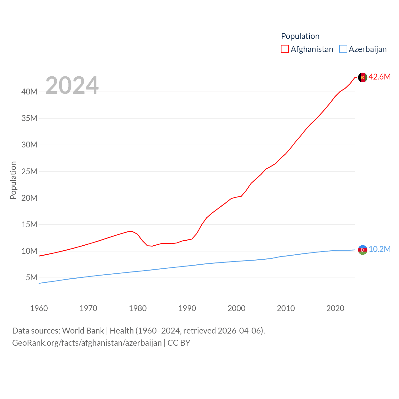 Afghanistan has a population of 42.6M (ranked 36/197), compared with 10.2M in Azerbaijan (ranked 95/197). Afghanistan's land area is 251,827 sq mi versus 31,911 sq mi for Azerbaijan (ranked 40th vs. 112th).