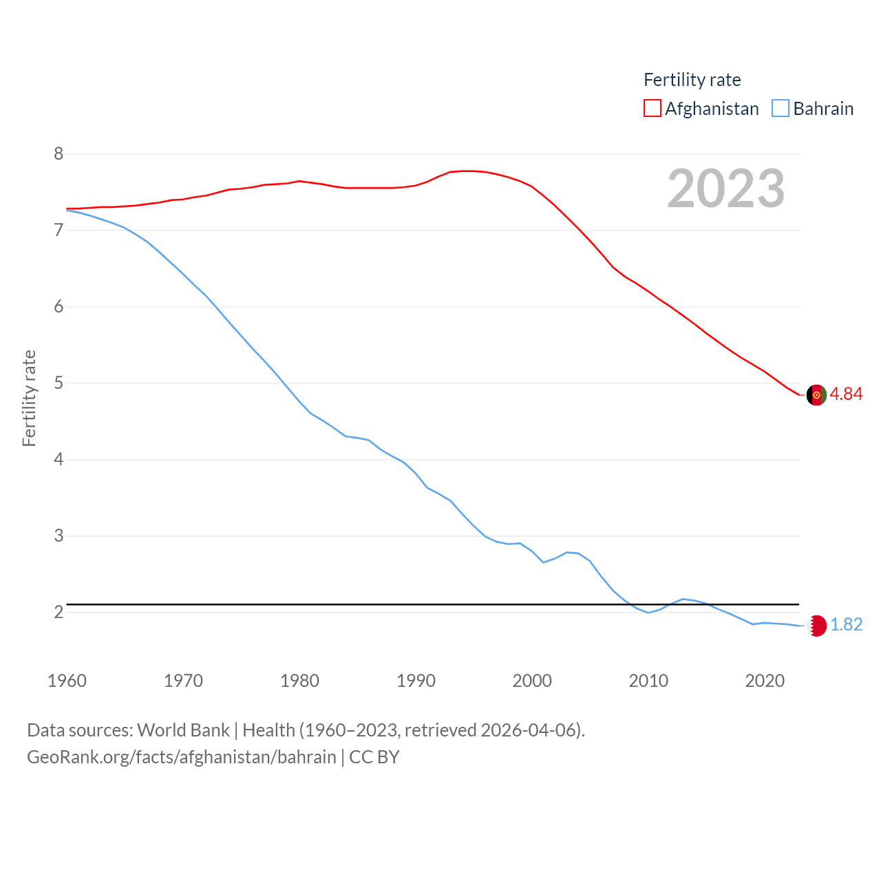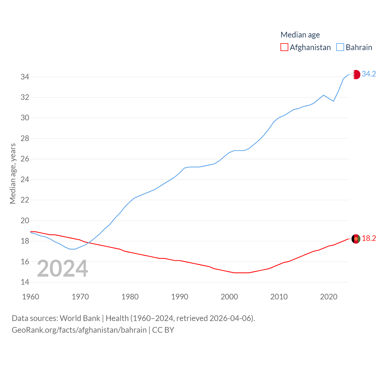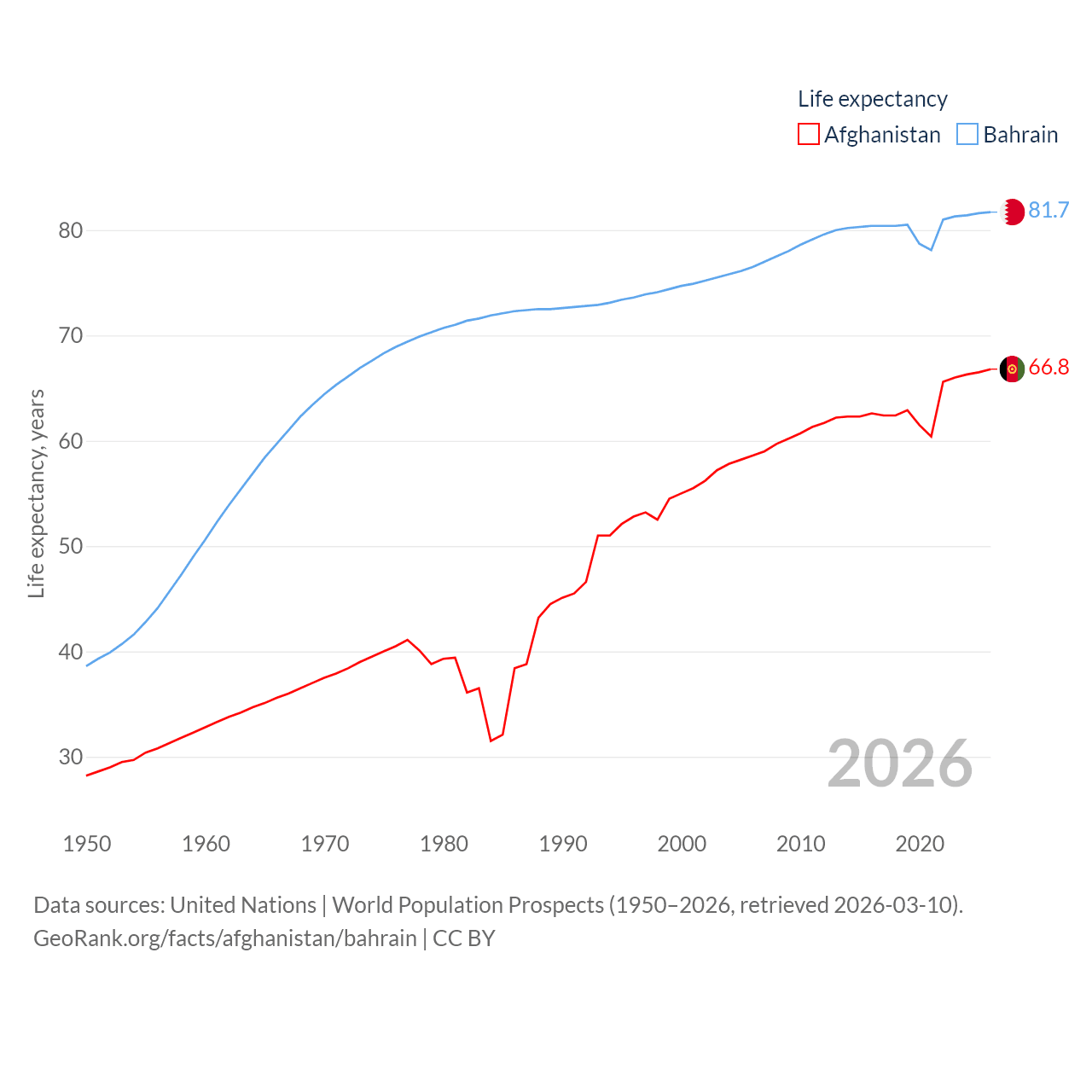 Afghanistan has a population of 42.6M (ranked 36/197), compared with 1.59M in Bahrain (ranked 151/197). Afghanistan's land area is 251,827 sq mi versus 309 sq mi for Bahrain (ranked 40th vs. 174th).