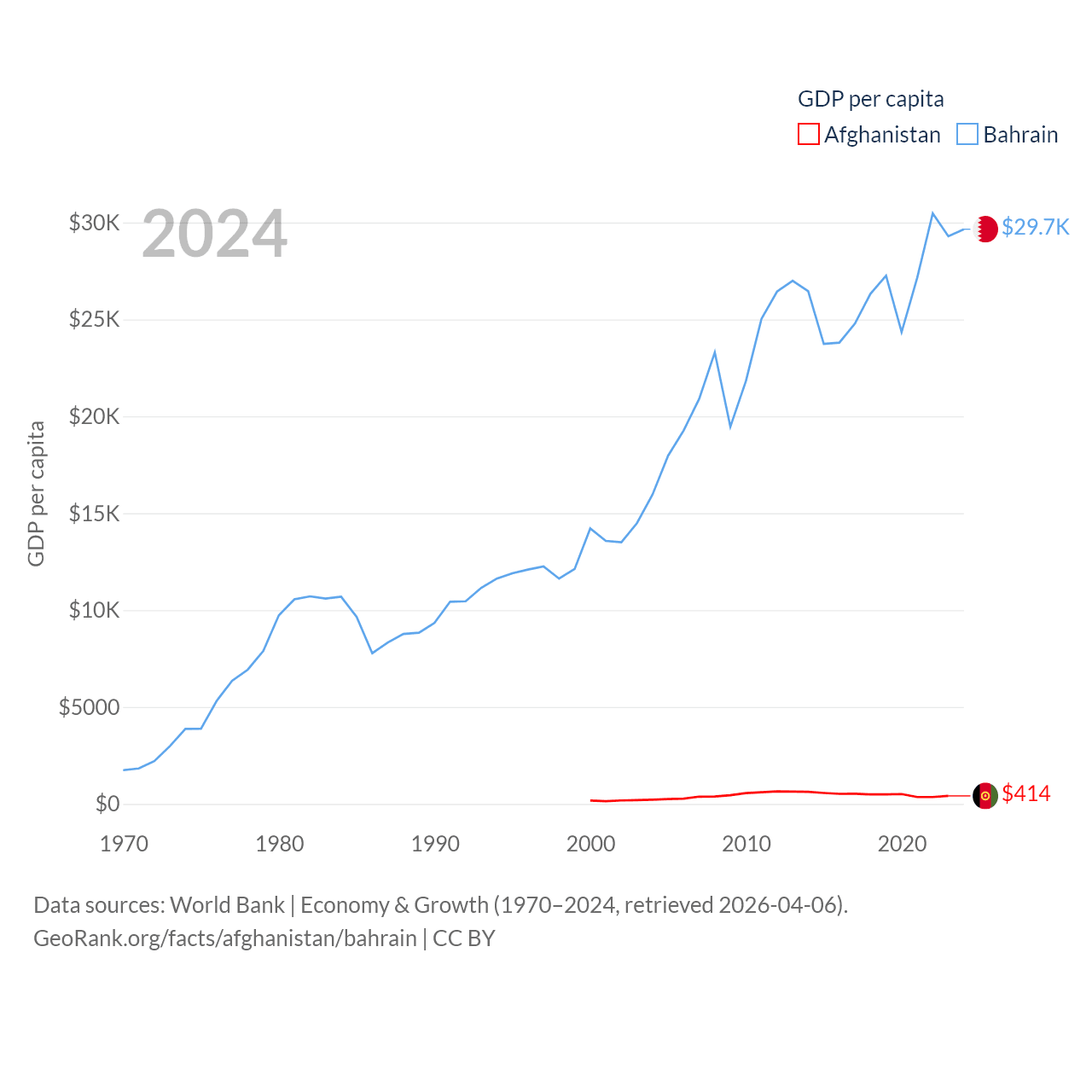 By GDP, Afghanistan ranks 137/197 ($17.2B) and Bahrain ranks 96/197 ($47.1B). By GDP per capita, Afghanistan ranks 196/197 ($414), while Bahrain ranks 42/197 ($29,654).