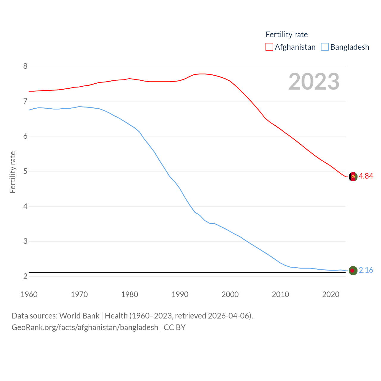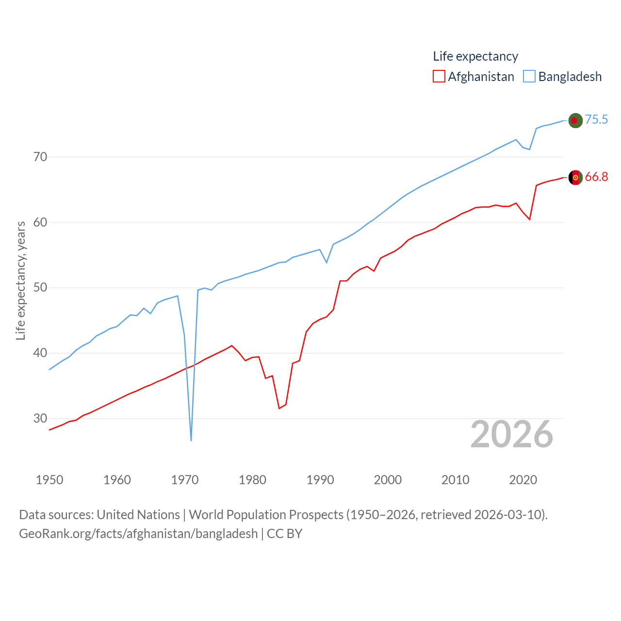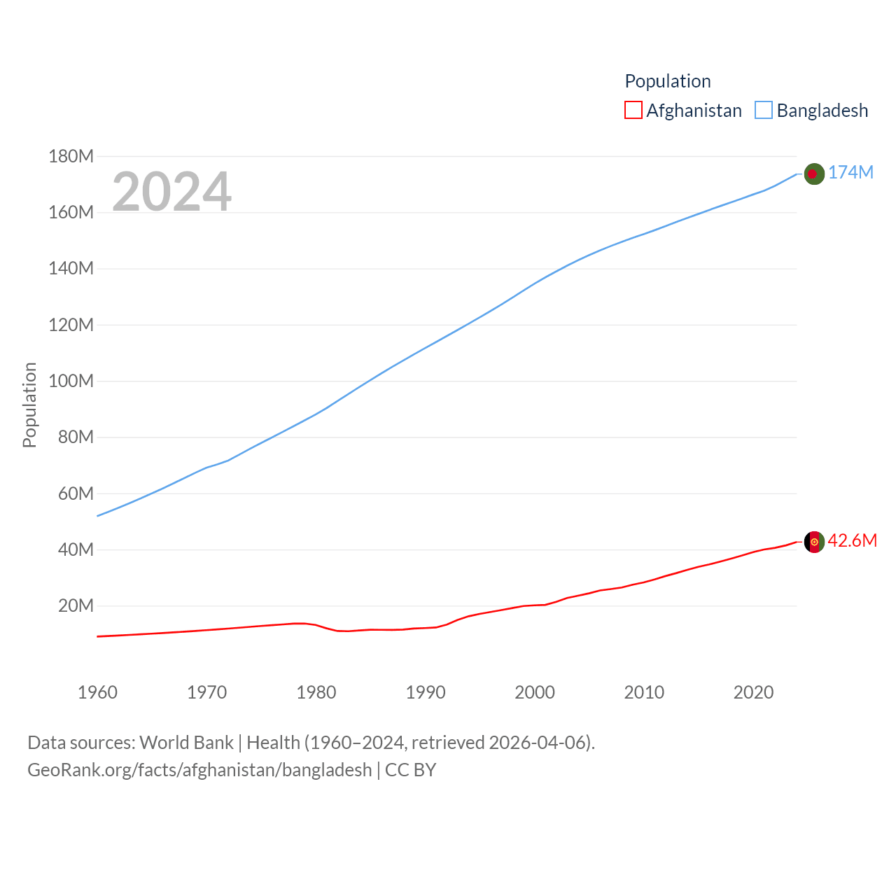 Afghanistan has a population of 42.6M (ranked 36/197), compared with 174M in Bangladesh (ranked 8/197). Afghanistan's land area is 251,827 sq mi versus 50,186 sq mi for Bangladesh (ranked 40th vs. 94th).